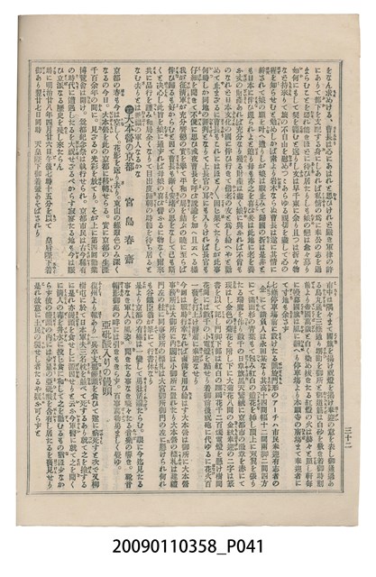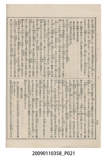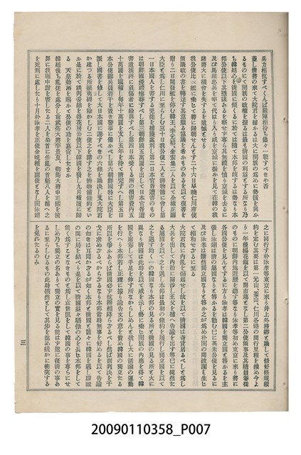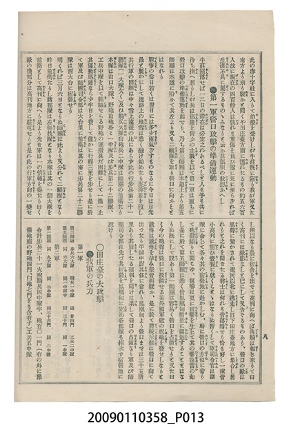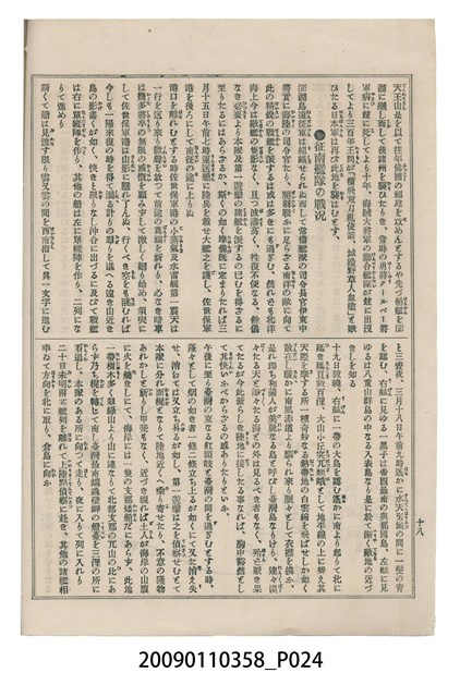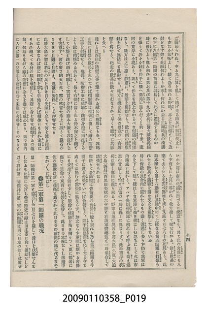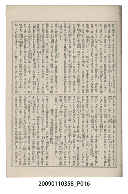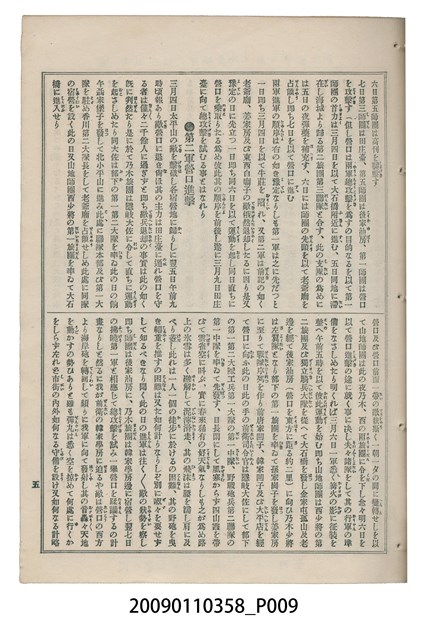 第9編於明治28(1895)年5月25日發行,內容分為論說、插畫、記事、漫錄四部分,野口勝一總論「征清起因論中」,「記事」記載了1895年3月攻陷營口、佔領澎湖島、征南艦隊戰況、進擊圓頂半島、漁翁島砲臺、拱北砲臺的抵抗、設置行政廳、調查戰利品…等戰況。封面圖為京都凱旋門圖,尾形月耕畫,有「帝國萬歲」印。