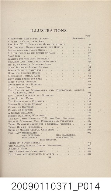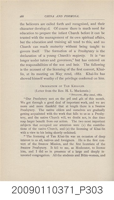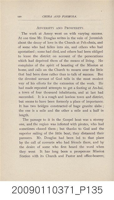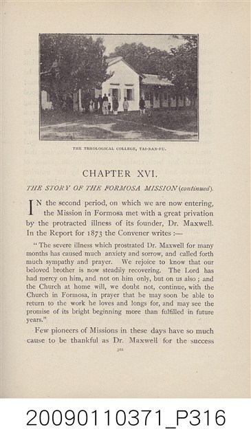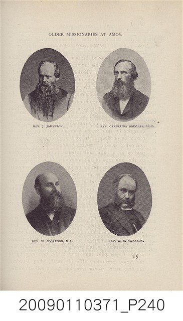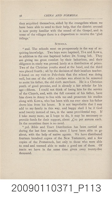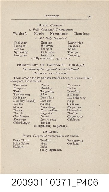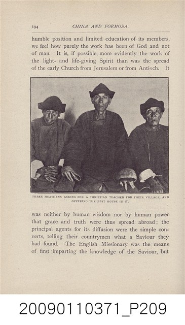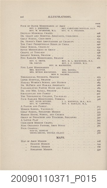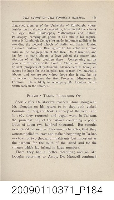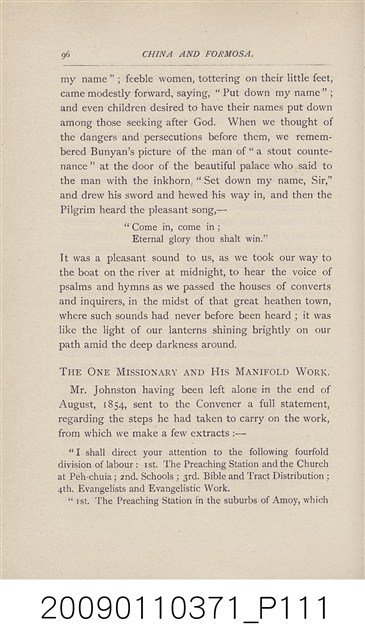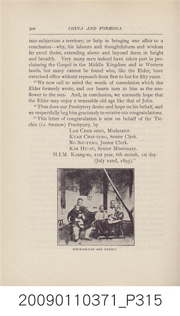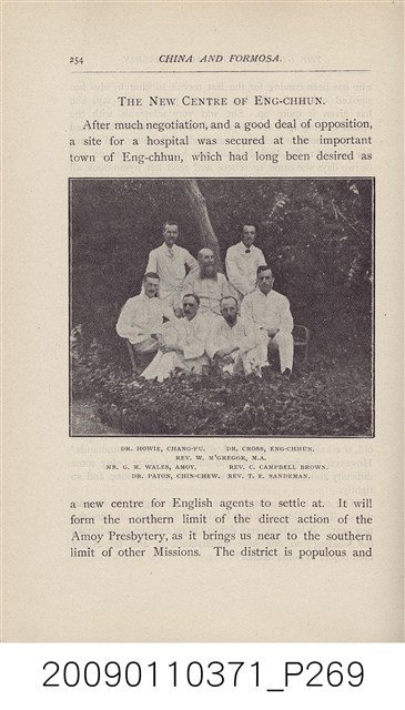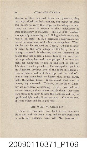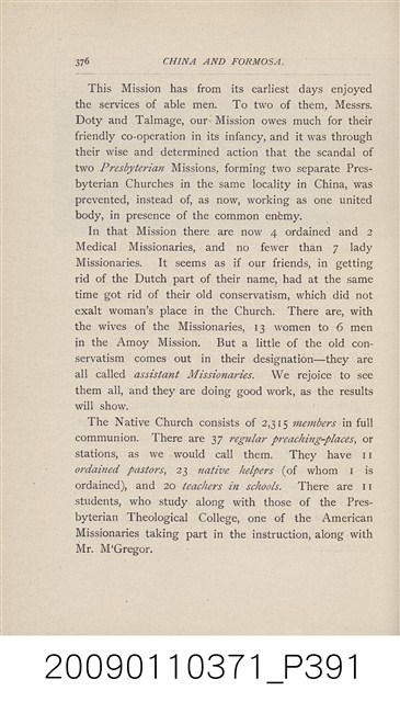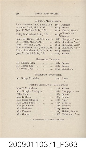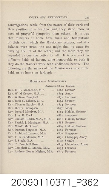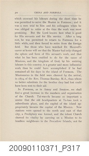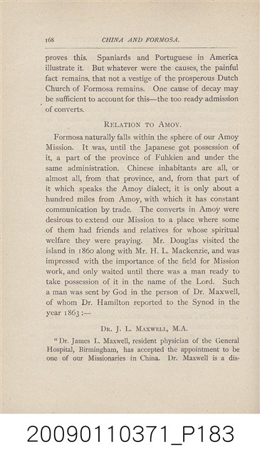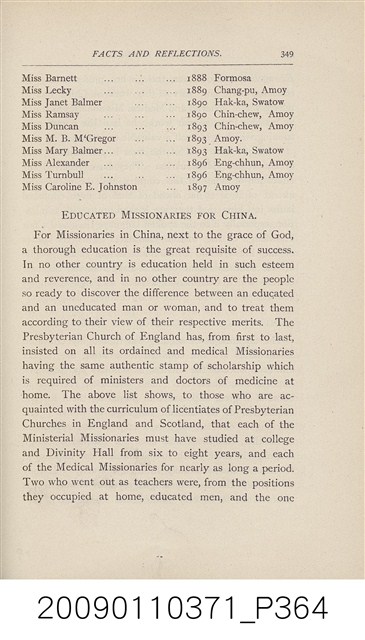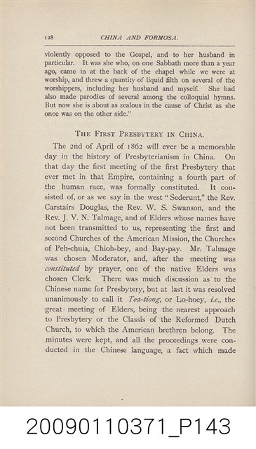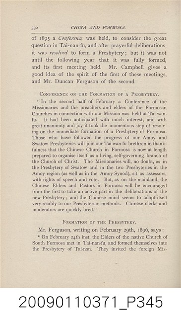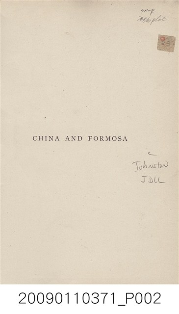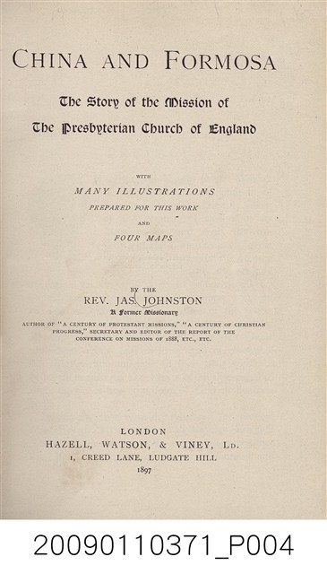 1.《中國與臺灣:英國長老教會傳教的故事》(China and Formosa: The Story of the Mission of the Presbyterian Church of England)一書,James Johnston(1819-1905)牧師撰,1897年英國倫敦Hazell, Waton, & Viney公司出版,附有廈門、汕頭、臺灣、新加坡4張地圖,及多張黑白照片與插圖,全書約400頁,內容主要記錄英國長老教會自1847年起50年間,在中國廈門、汕頭、臺灣、新加坡等地傳教的情形及當地的人民、風俗。
