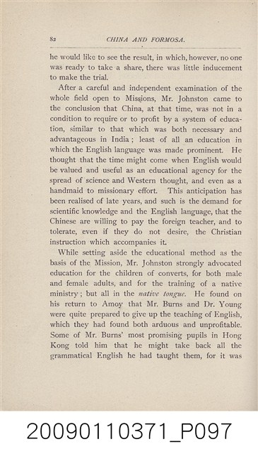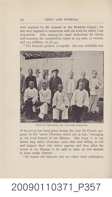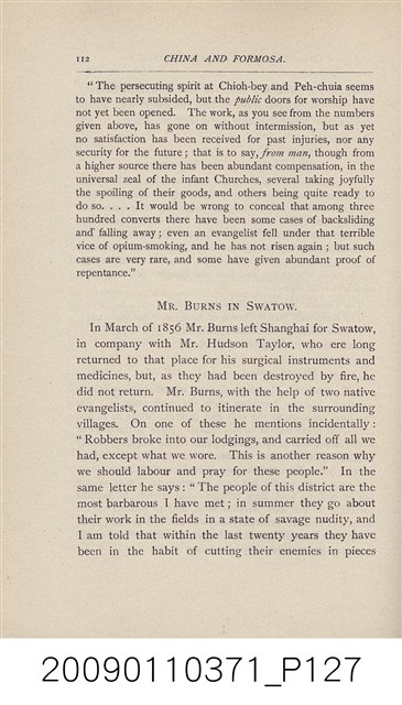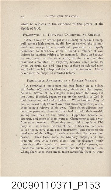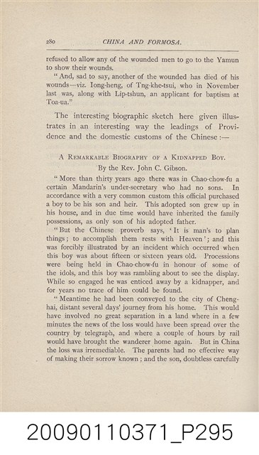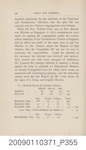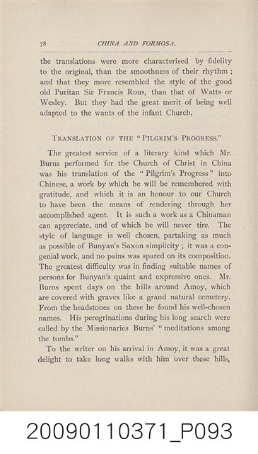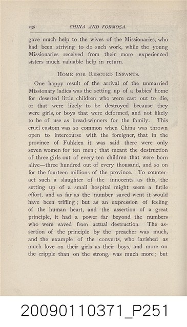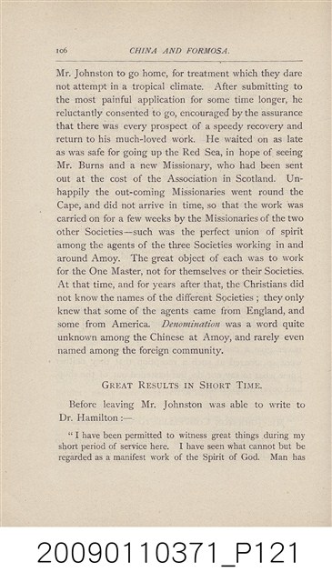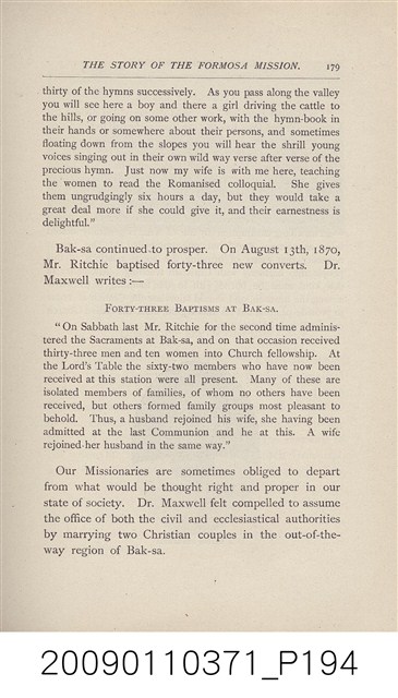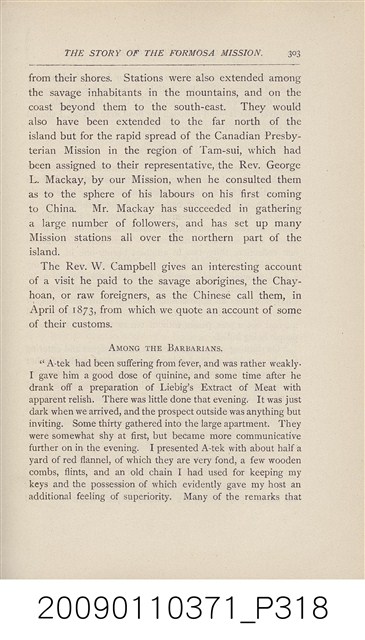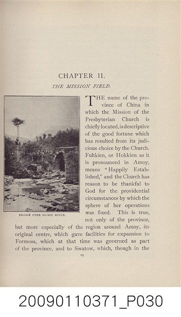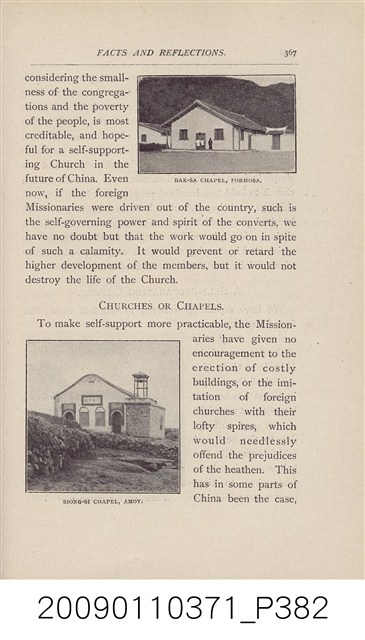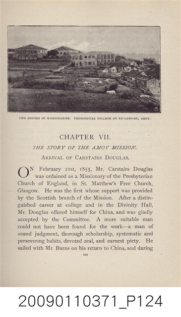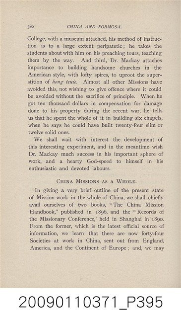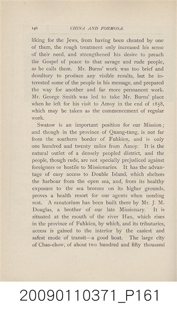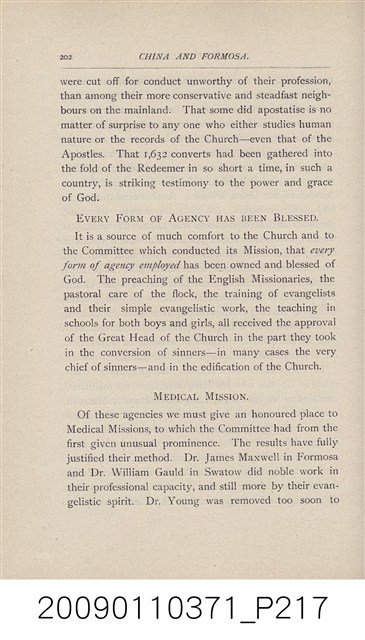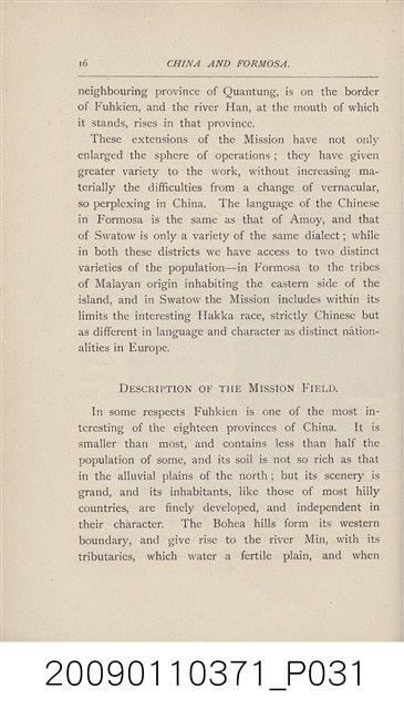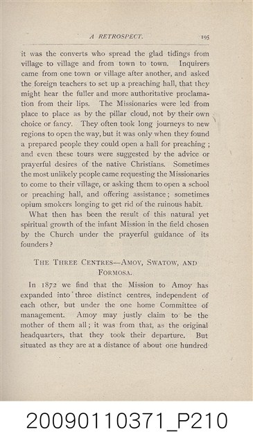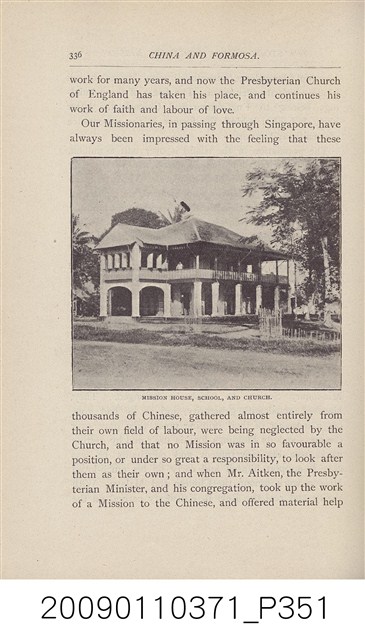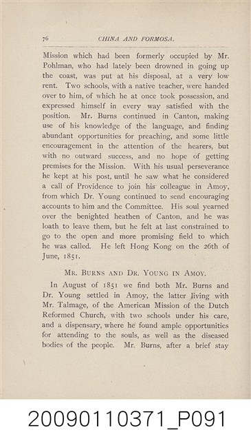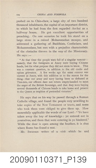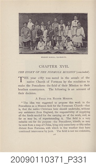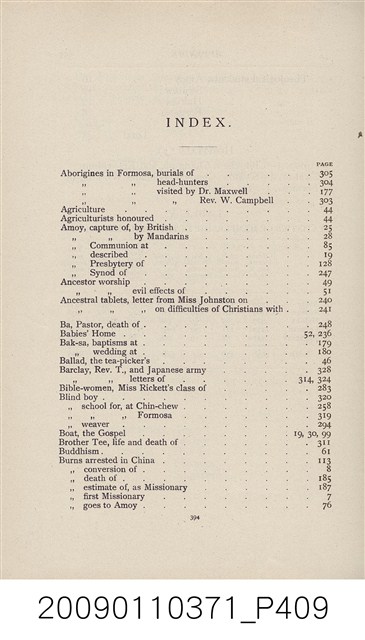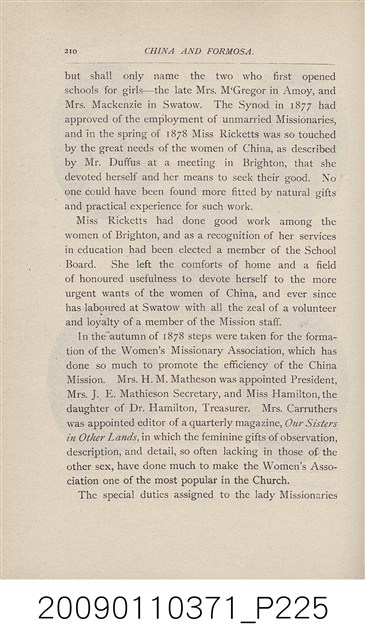 1.《中國與臺灣:英國長老教會傳教的故事》(China and Formosa: The Story of the Mission of the Presbyterian Church of England)一書,James Johnston(1819-1905)牧師撰,1897年英國倫敦Hazell, Waton, & Viney公司出版,附有廈門、汕頭、臺灣、新加坡4張地圖,及多張黑白照片與插圖,全書約400頁,內容主要記錄英國長老教會自1847年起50年間,在中國廈門、汕頭、臺灣、新加坡等地傳教的情形及當地的人民、風俗。