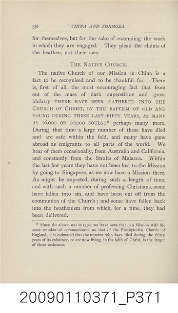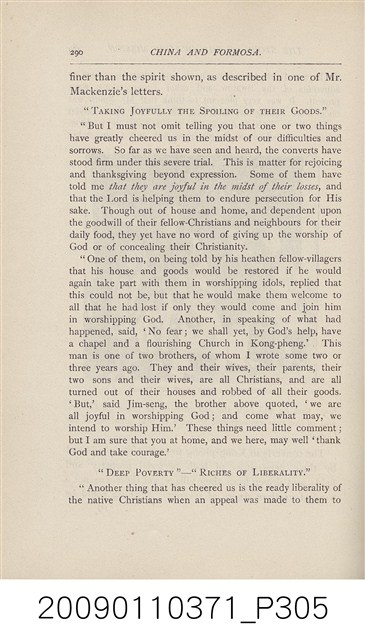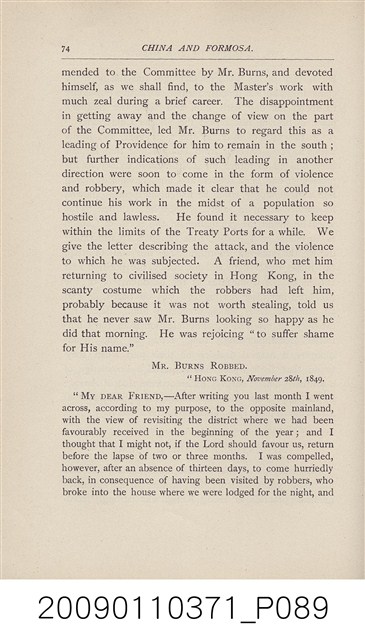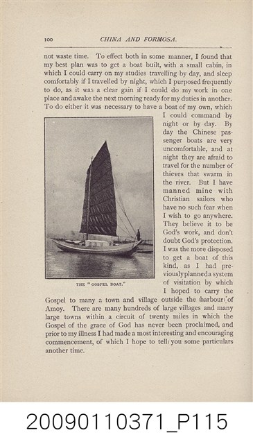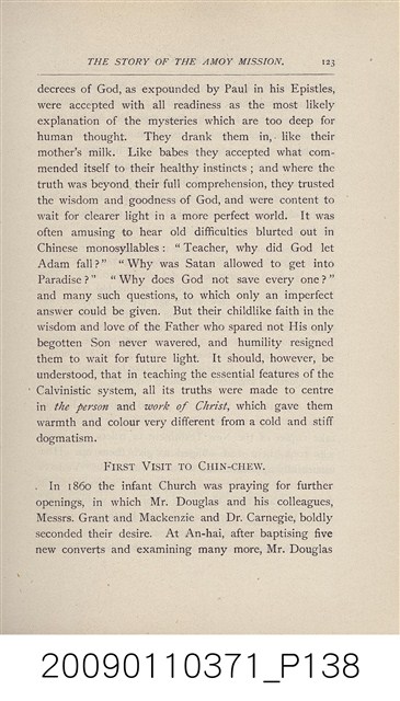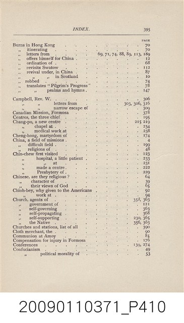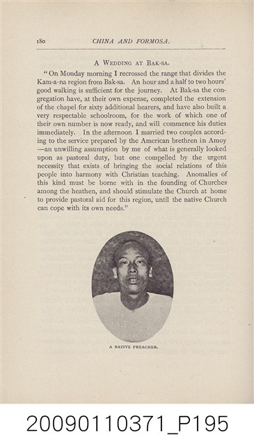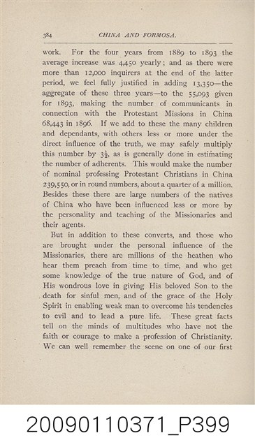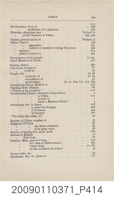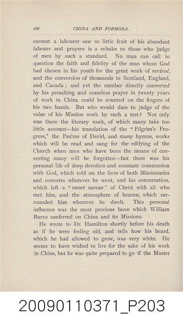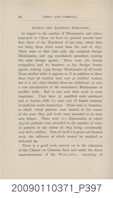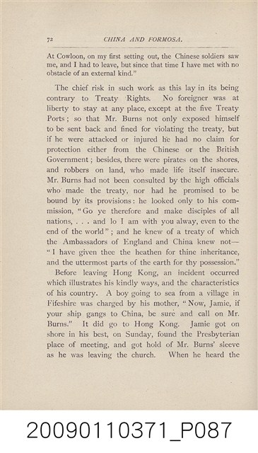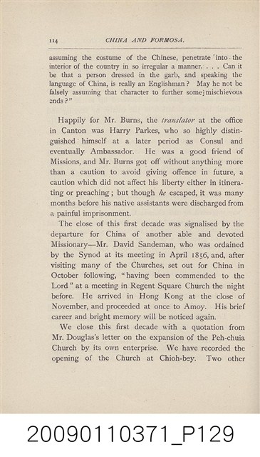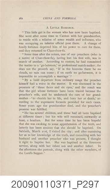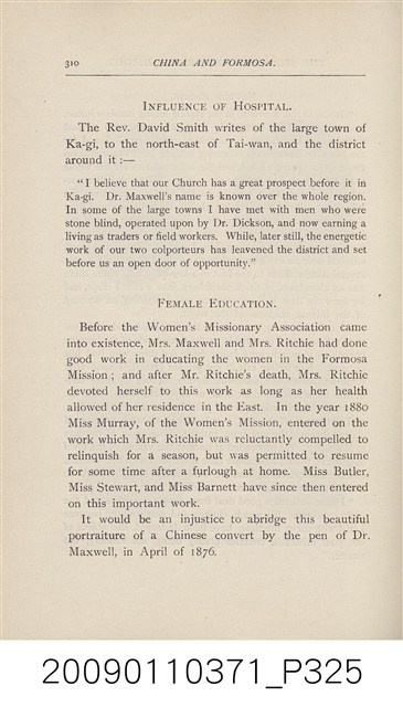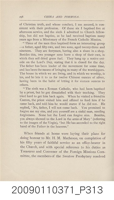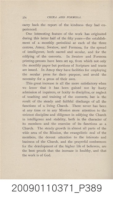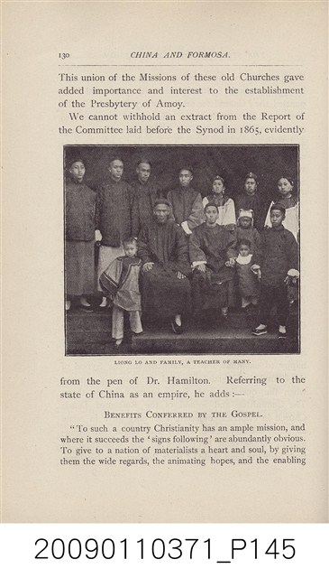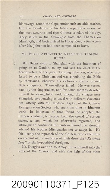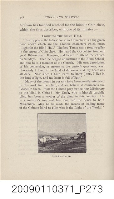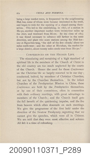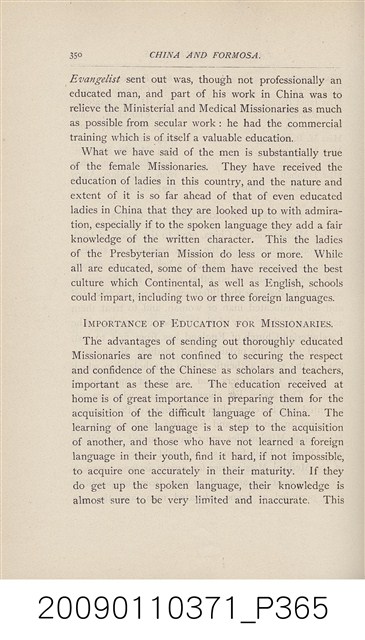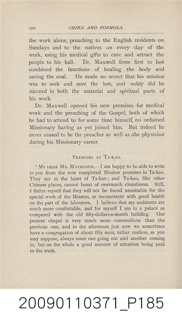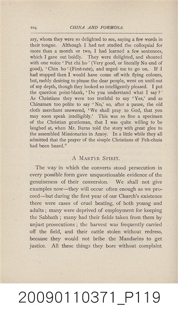 1.《中國與臺灣:英國長老教會傳教的故事》(China and Formosa: The Story of the Mission of the Presbyterian Church of England)一書,James Johnston(1819-1905)牧師撰,1897年英國倫敦Hazell, Waton, & Viney公司出版,附有廈門、汕頭、臺灣、新加坡4張地圖,及多張黑白照片與插圖,全書約400頁,內容主要記錄英國長老教會自1847年起50年間,在中國廈門、汕頭、臺灣、新加坡等地傳教的情形及當地的人民、風俗。