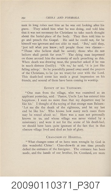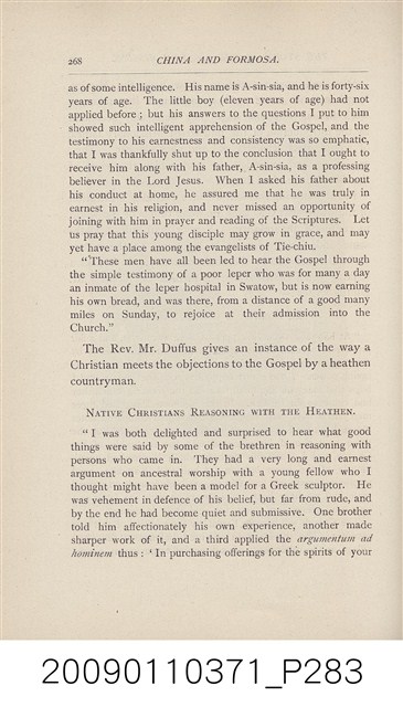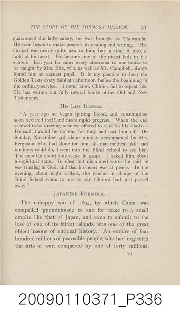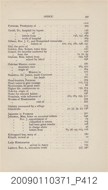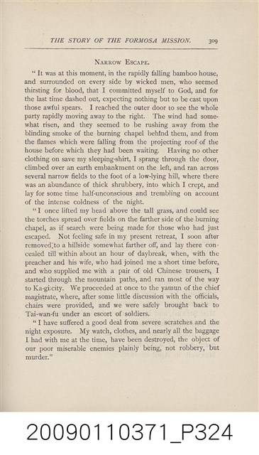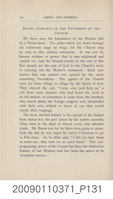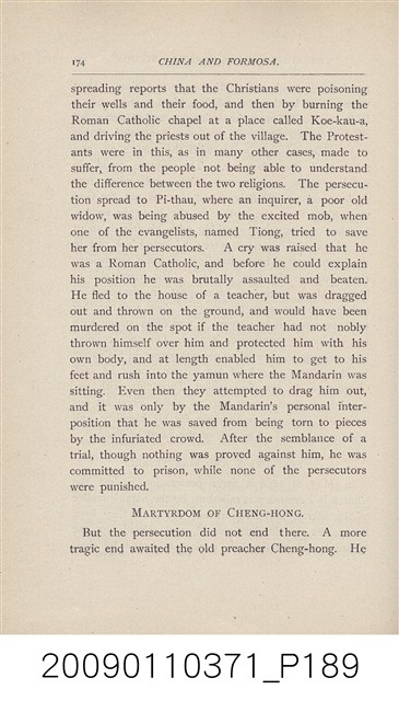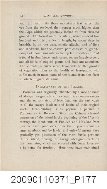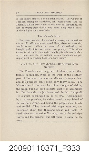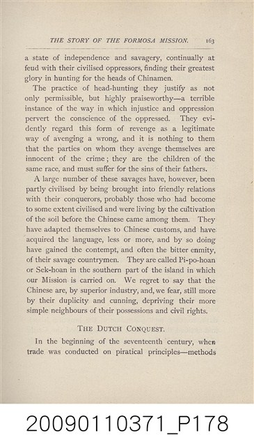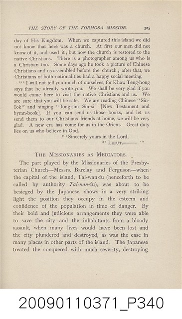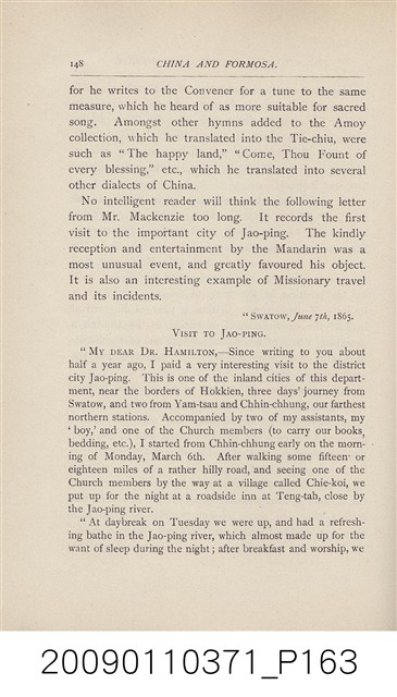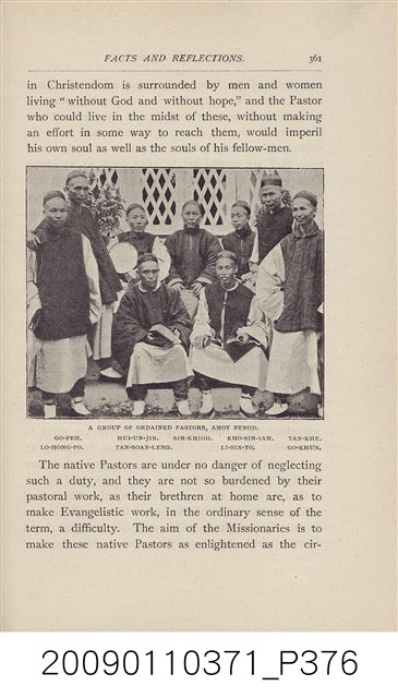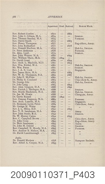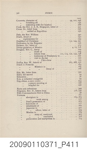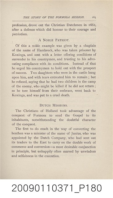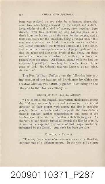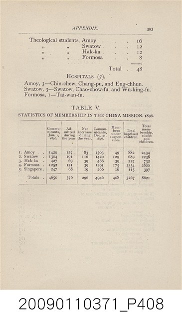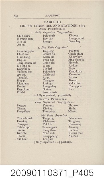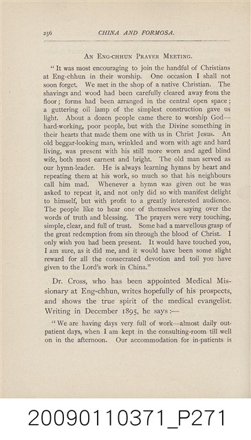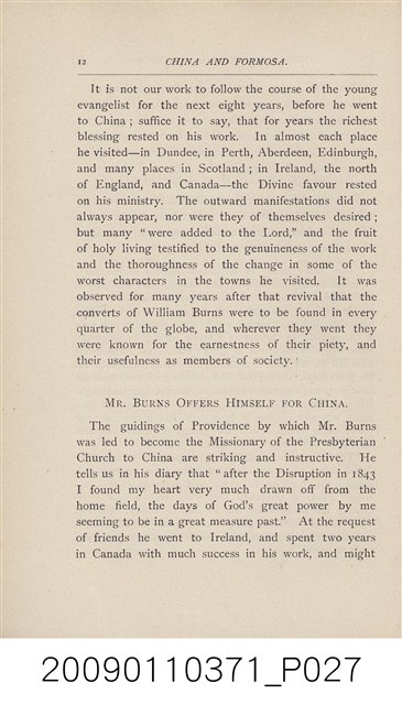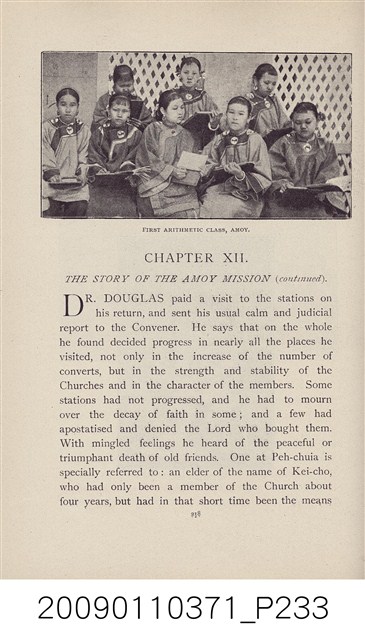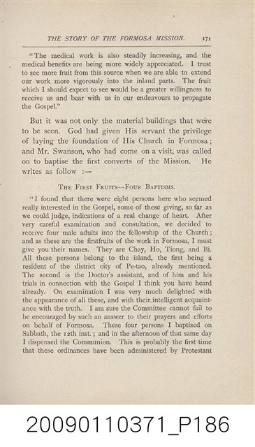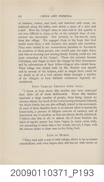 1.《中國與臺灣:英國長老教會傳教的故事》(China and Formosa: The Story of the Mission of the Presbyterian Church of England)一書,James Johnston(1819-1905)牧師撰,1897年英國倫敦Hazell, Waton, & Viney公司出版,附有廈門、汕頭、臺灣、新加坡4張地圖,及多張黑白照片與插圖,全書約400頁,內容主要記錄英國長老教會自1847年起50年間,在中國廈門、汕頭、臺灣、新加坡等地傳教的情形及當地的人民、風俗。