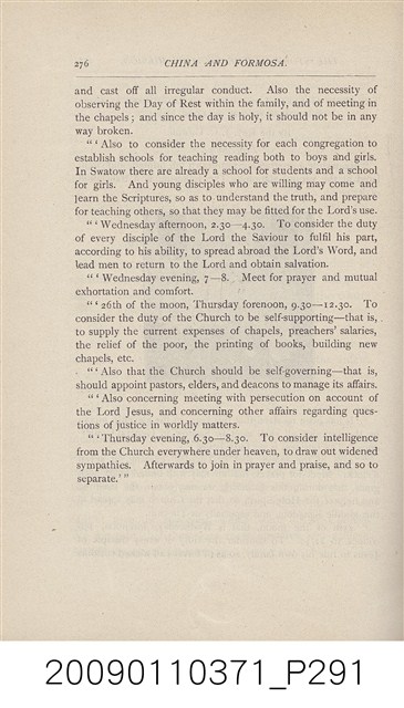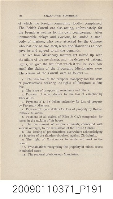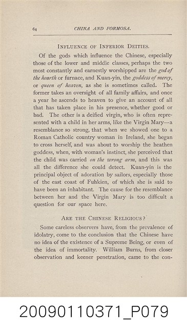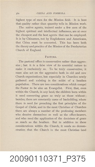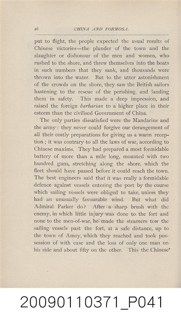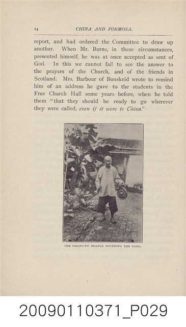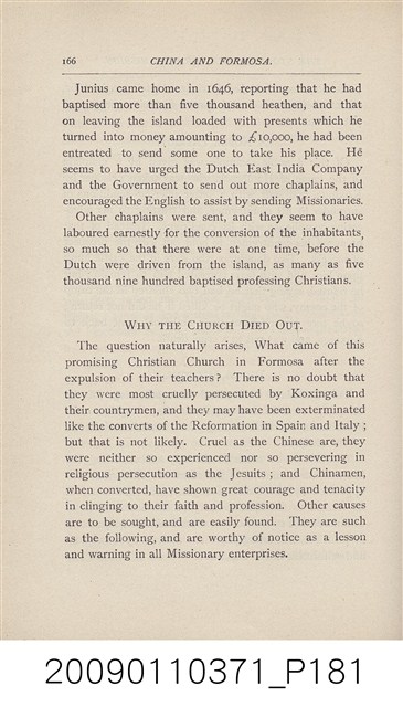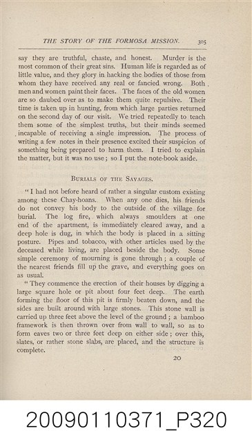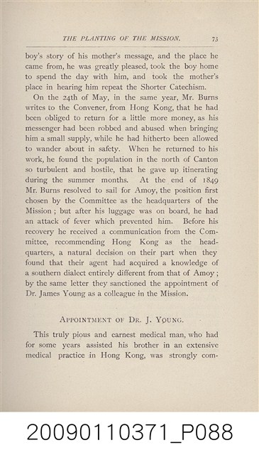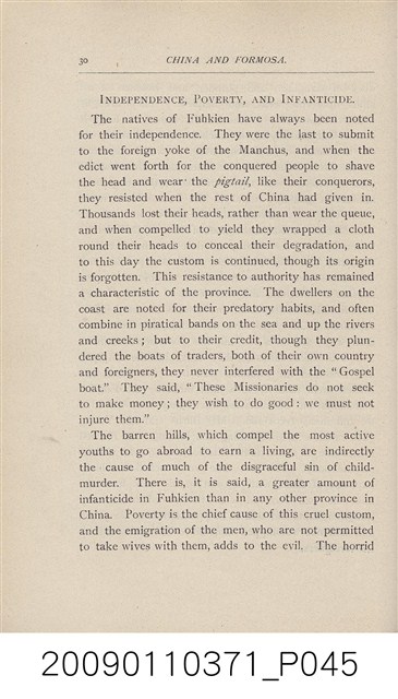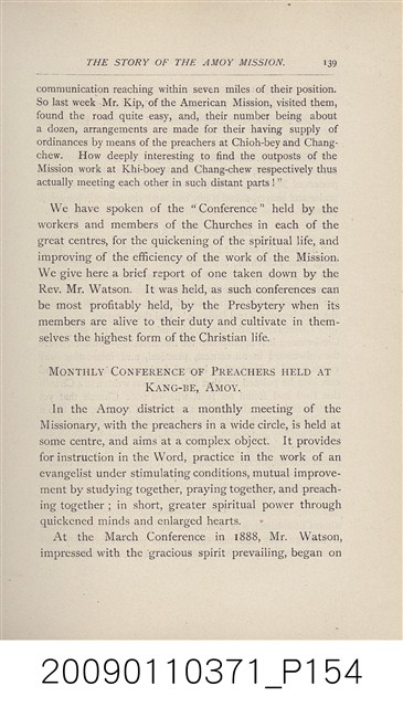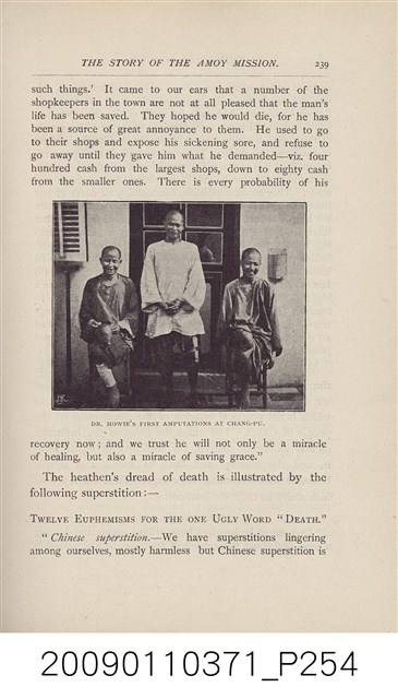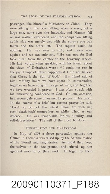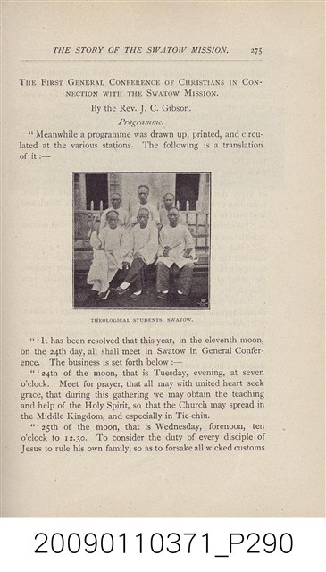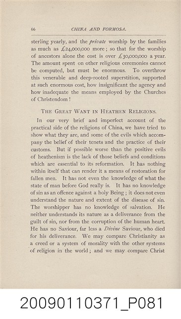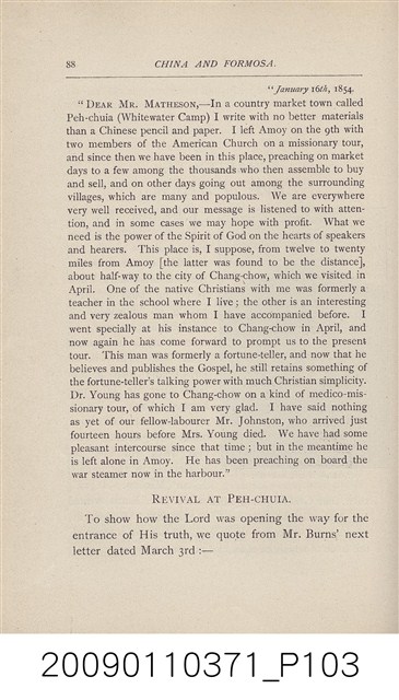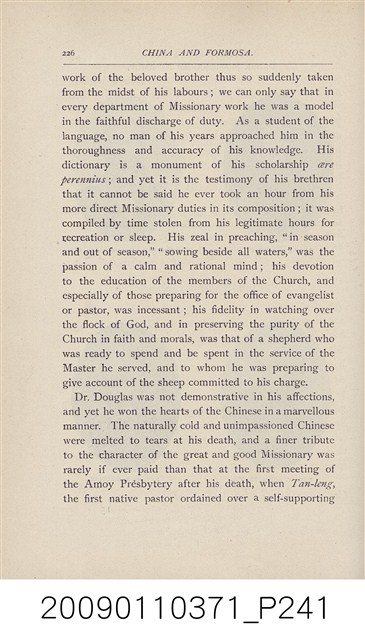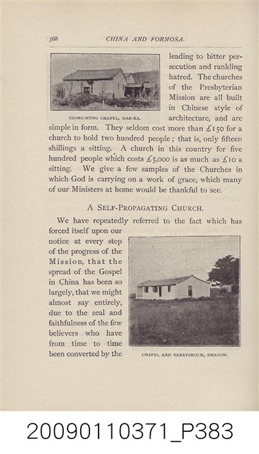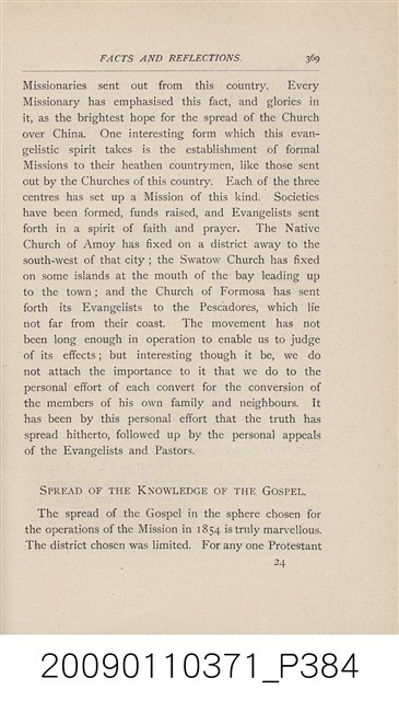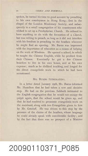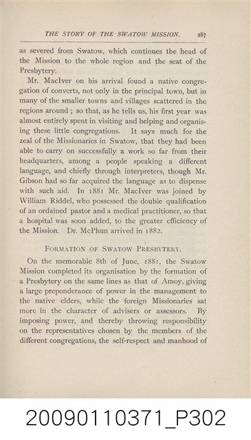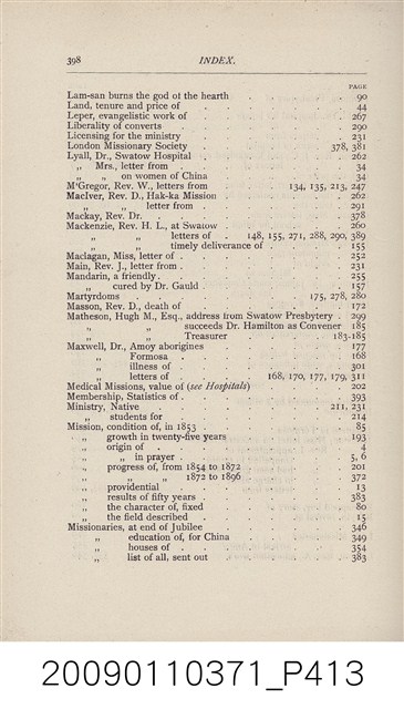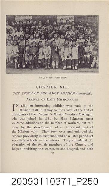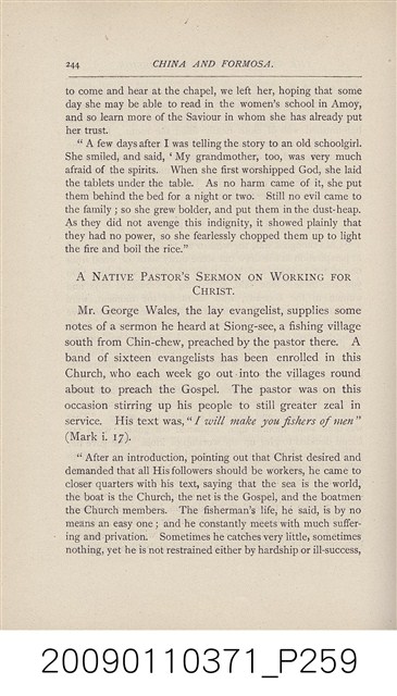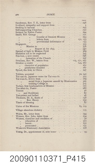 1.《中國與臺灣:英國長老教會傳教的故事》(China and Formosa: The Story of the Mission of the Presbyterian Church of England)一書,James Johnston(1819-1905)牧師撰,1897年英國倫敦Hazell, Waton, & Viney公司出版,附有廈門、汕頭、臺灣、新加坡4張地圖,及多張黑白照片與插圖,全書約400頁,內容主要記錄英國長老教會自1847年起50年間,在中國廈門、汕頭、臺灣、新加坡等地傳教的情形及當地的人民、風俗。