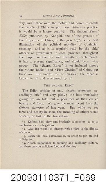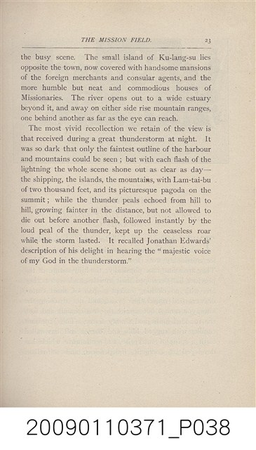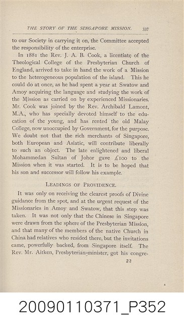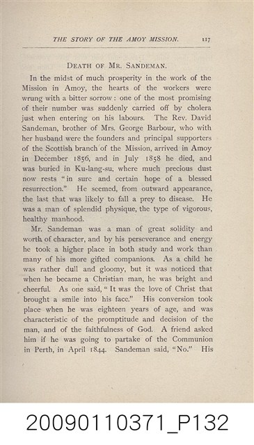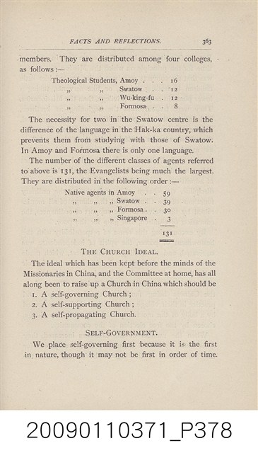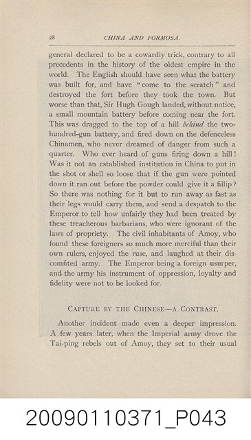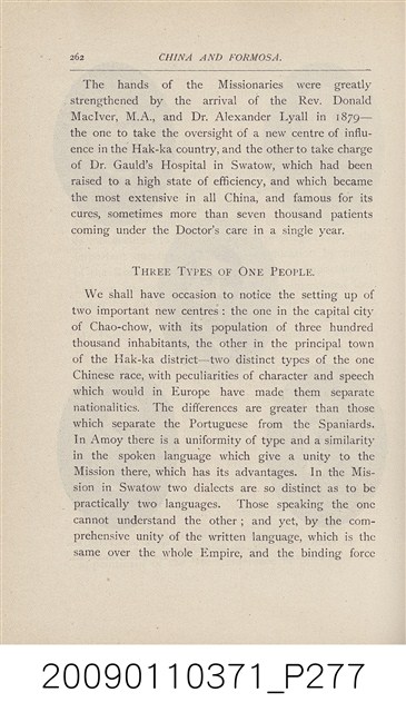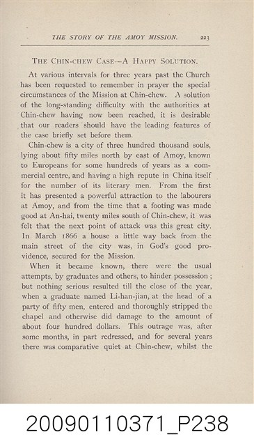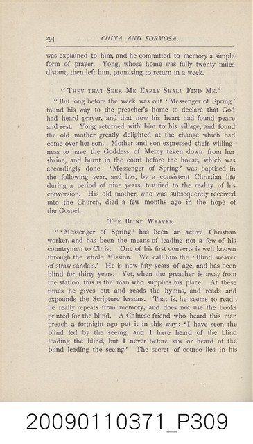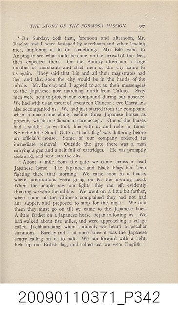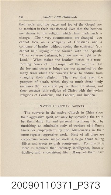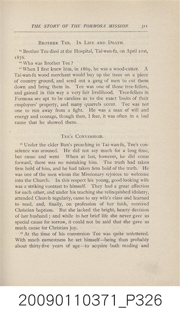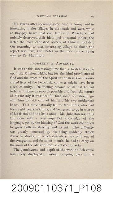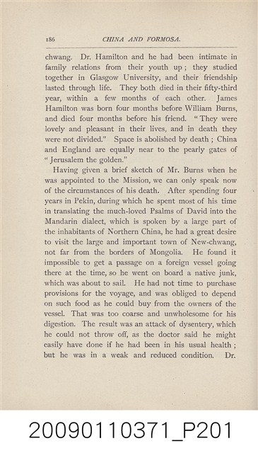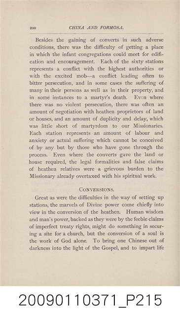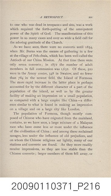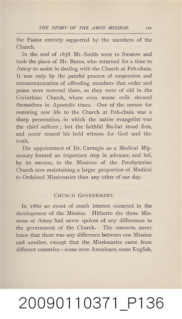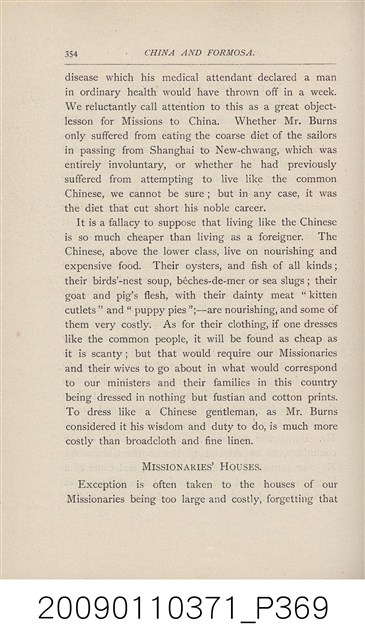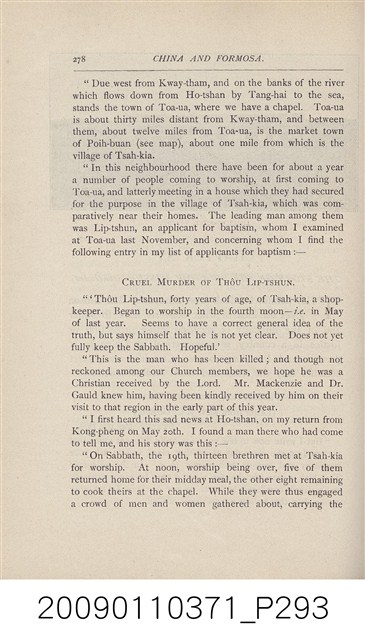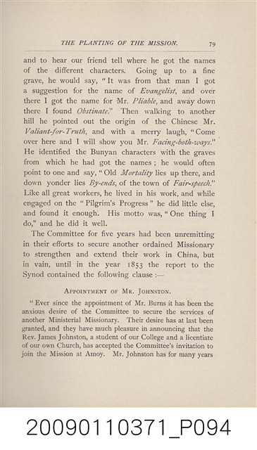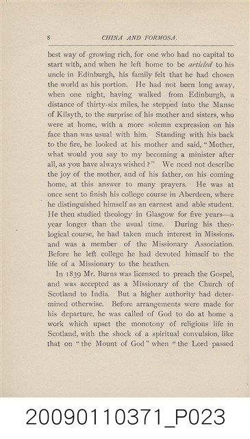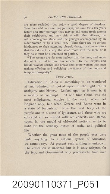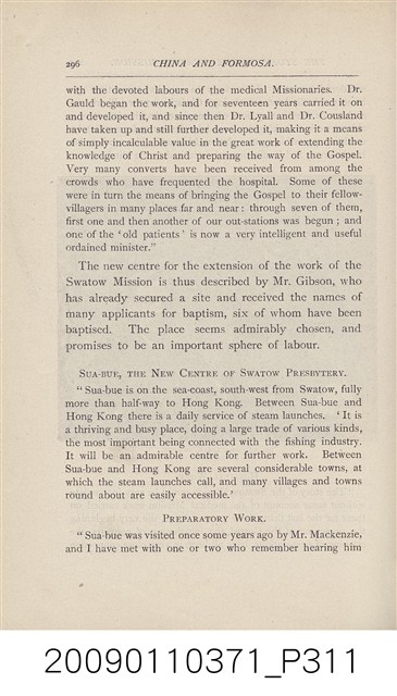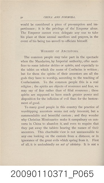 1.《中國與臺灣:英國長老教會傳教的故事》(China and Formosa: The Story of the Mission of the Presbyterian Church of England)一書,James Johnston(1819-1905)牧師撰,1897年英國倫敦Hazell, Waton, & Viney公司出版,附有廈門、汕頭、臺灣、新加坡4張地圖,及多張黑白照片與插圖,全書約400頁,內容主要記錄英國長老教會自1847年起50年間,在中國廈門、汕頭、臺灣、新加坡等地傳教的情形及當地的人民、風俗。