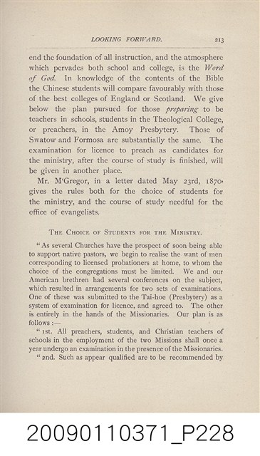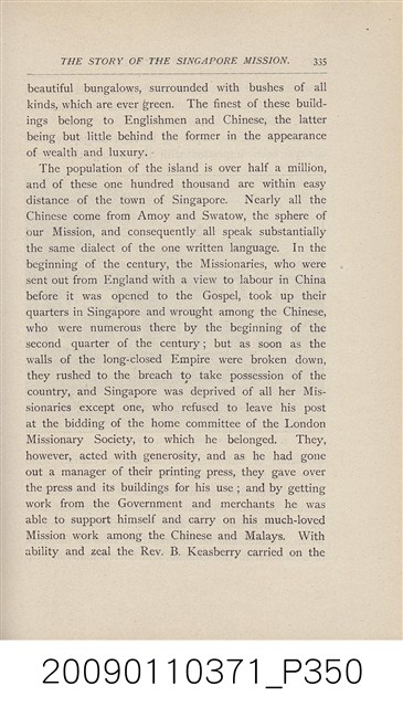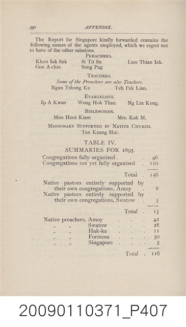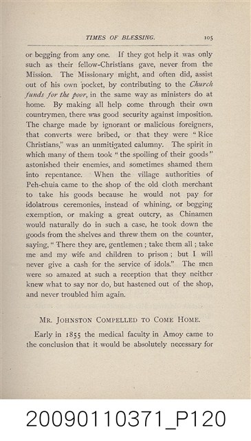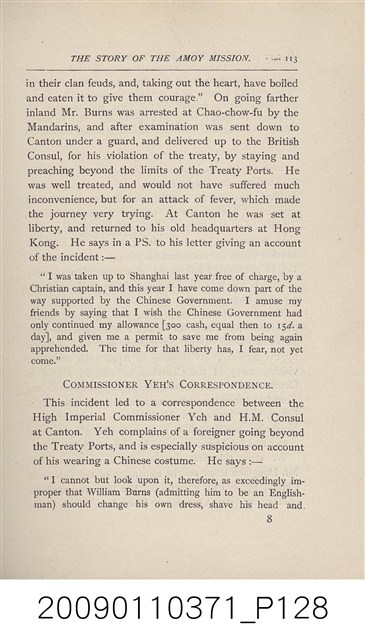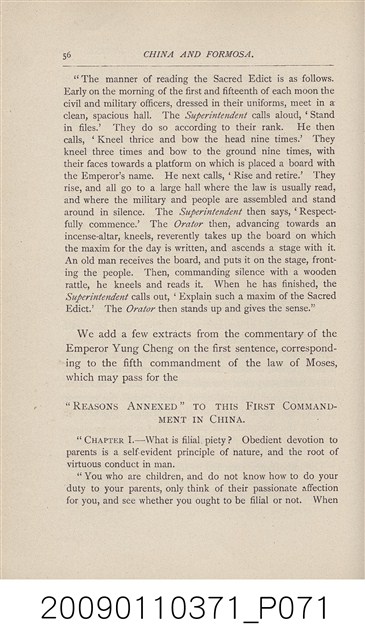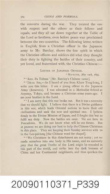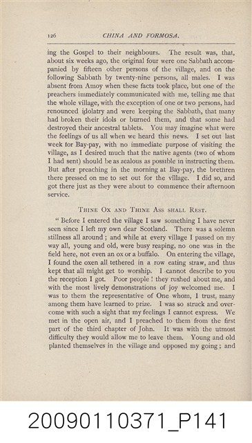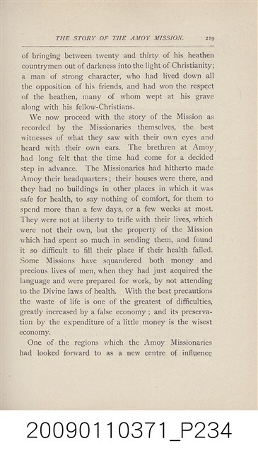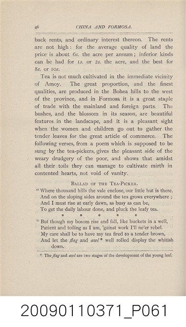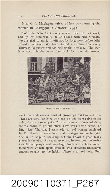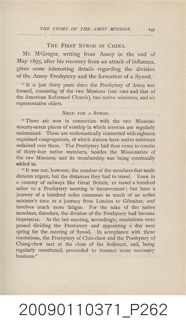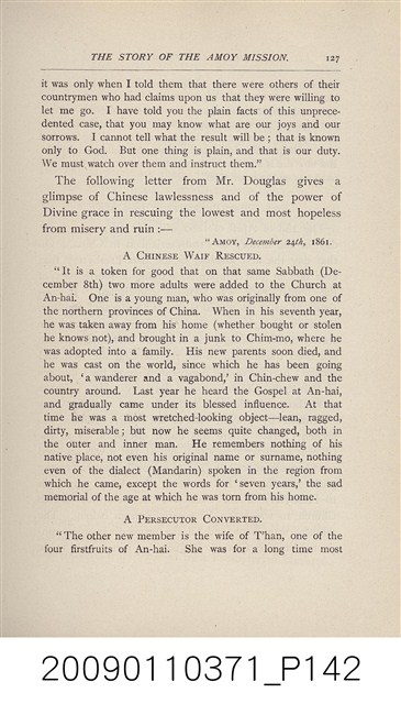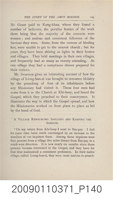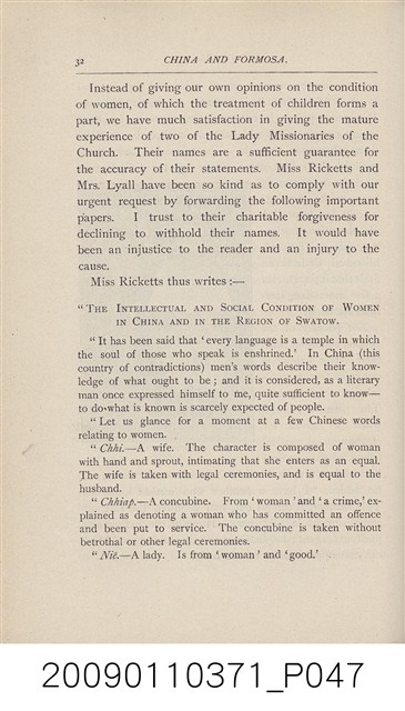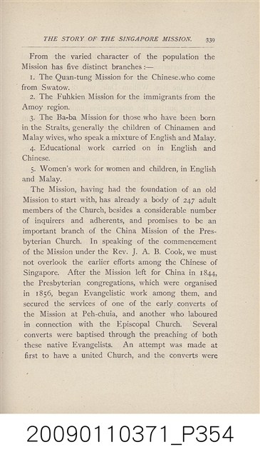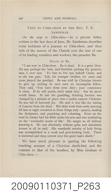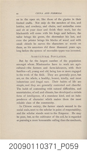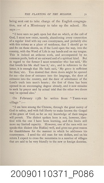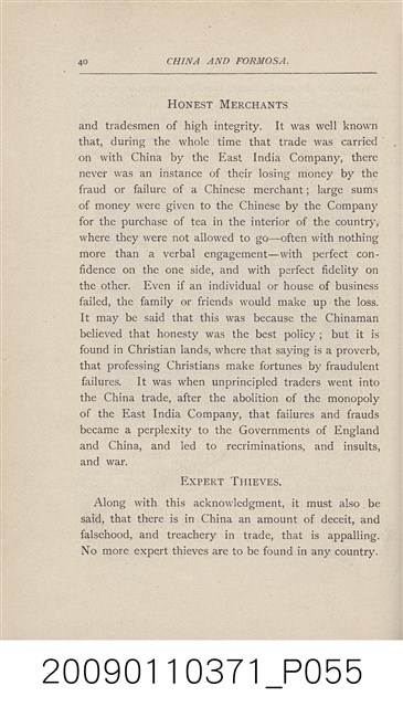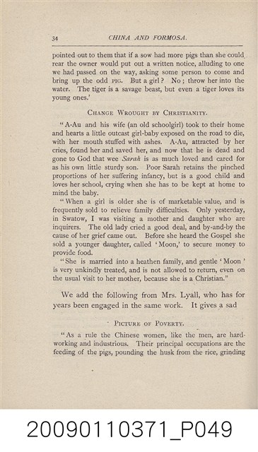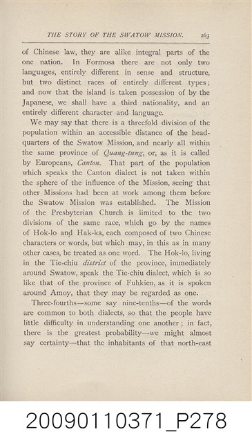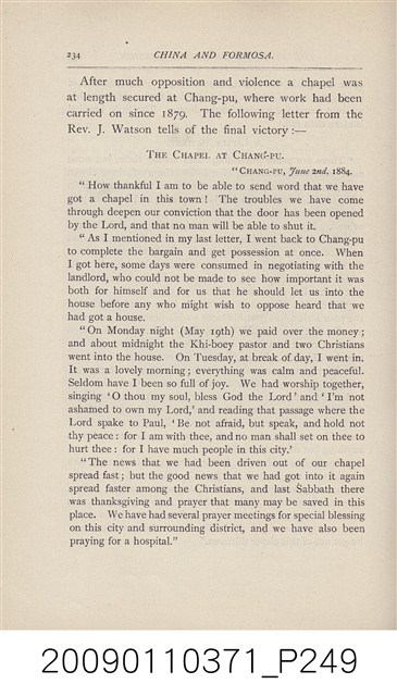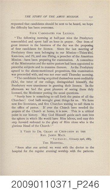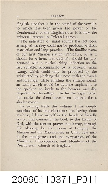 1.《中國與臺灣:英國長老教會傳教的故事》(China and Formosa: The Story of the Mission of the Presbyterian Church of England)一書,James Johnston(1819-1905)牧師撰,1897年英國倫敦Hazell, Waton, & Viney公司出版,附有廈門、汕頭、臺灣、新加坡4張地圖,及多張黑白照片與插圖,全書約400頁,內容主要記錄英國長老教會自1847年起50年間,在中國廈門、汕頭、臺灣、新加坡等地傳教的情形及當地的人民、風俗。