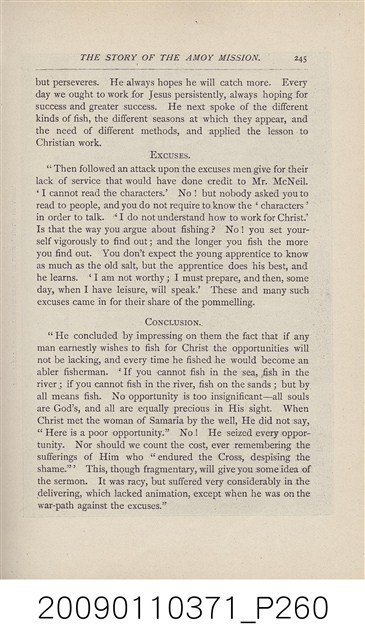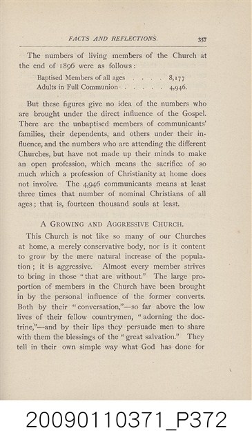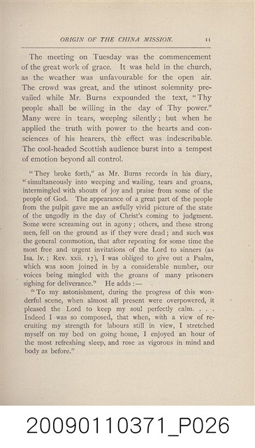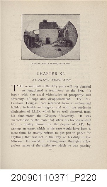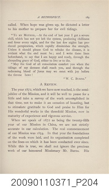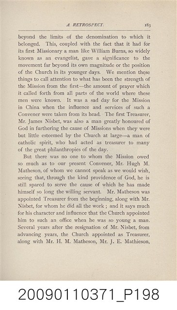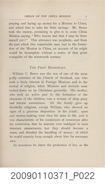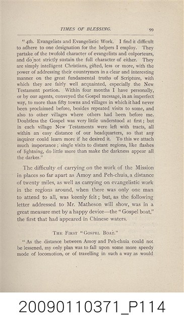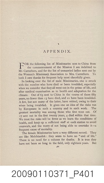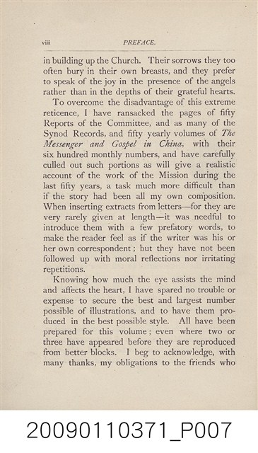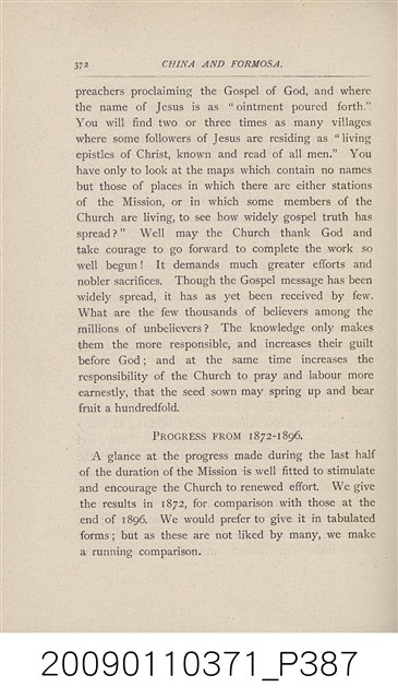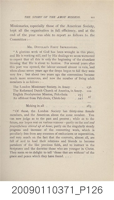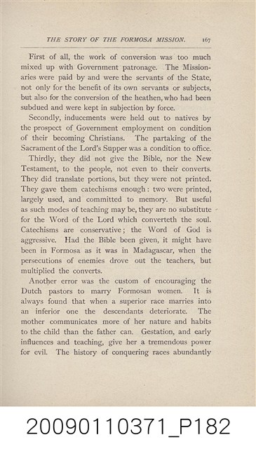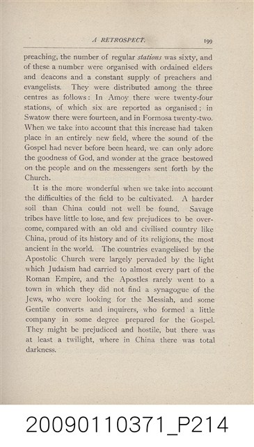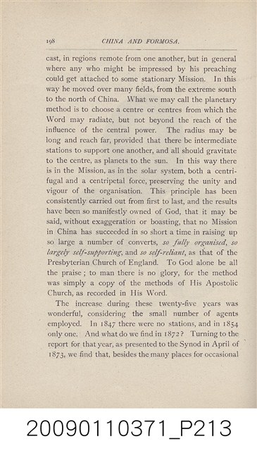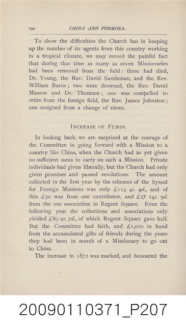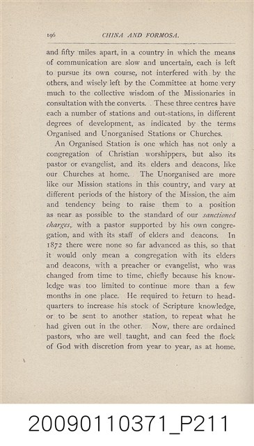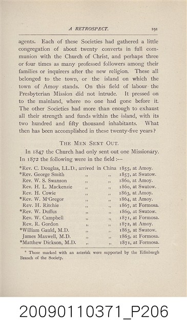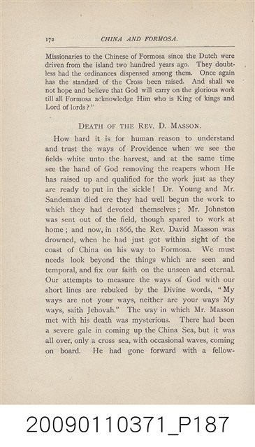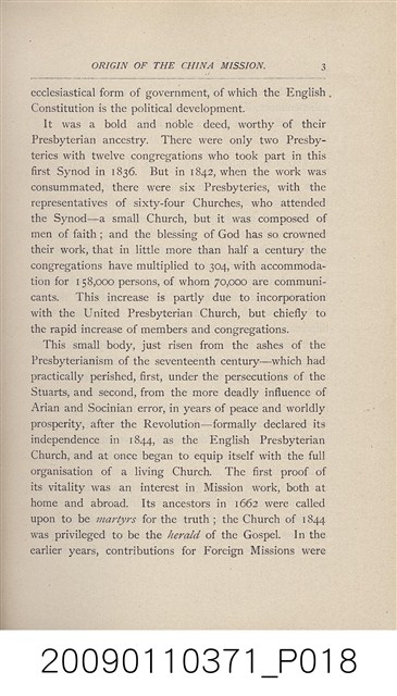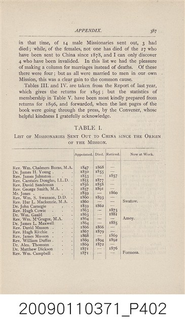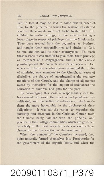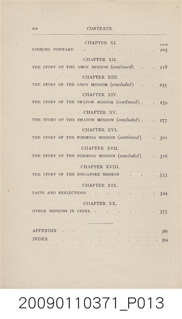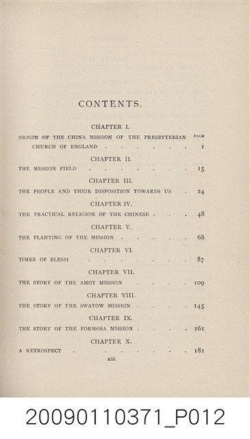 2.全書分為20章,內容包括:第1章-英國長老教會至中國傳教的起源、第2章-傳教的範圍、第9章-福爾摩沙(臺灣)傳教的故事(內提及1864年馬雅各曾經來臺)、第16章-福爾摩沙傳教的故事(續篇)、第17章-福爾摩沙傳教的故事(總結)。附錄有「傳教士一覽表」、「女傳教士一覽表」、「教堂與傳教據點一覽表」(1895年)、「1895年傳教情形摘要表」、「1896年會員人數統計表」等5表,記載了傳教士到任、死亡、退休的時間、及在何地傳教等情形。當時在臺灣的傳教士有:甘為霖(William Campbell,1871年到任)、巴克禮(Thomas Barclay,1874年到任)、安彼得(Peter Anderson,1878年到任)、宋忠堅(Duncan Ferguson,1889年到任)、梅監霧(Campbell N. Moody,1895年到任)、廉德烈(Andrew B. Nielson,1895年到任)、蘭大衛(David Landsborough,1895年到任)等人。