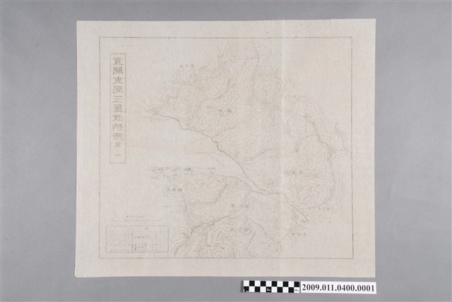 臺灣總督府專賣局〈宜蘭支局三星收納所之一〉,五萬分一等高線圖,屬〈宜蘭支局三星收納所〉北幅,標記出三星收納所的位置。有指北標示。圖面範圍為五十溪、カラモテ、モツコ山、中嶺、松羅溪、大湖桶、清水溪、大溪等宜蘭冷水坑一段的蘭陽溪南北二側地區,除稜線、河川、州界、郡界、道路的標示外,並標示出製腦地界、出張所及監督所、收納所、巡視所、警察所在地、林班界、蕃界等樟腦產業情形,從圖面可以觀察出當時製腦的分界線大致是沿著稜線、河川等自然界線而劃分。