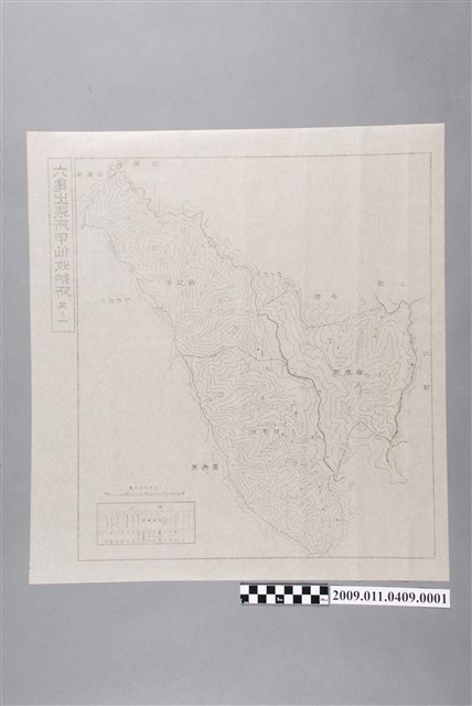 臺灣總督府專賣局〈五萬分一六龜出張所甲仙收納所之一〉,五萬分一等高線圖,屬〈六龜出張所甲仙收納所〉北幅,為甲仙收納所掌管的製腦地域圖。有指北標示。圖面範圍為南面山、霞山、新望嶺、タボオワ、タナイク(達娜伊谷)、勃子、草山、河表湖、大埔、蚊子只(那瑪夏)、美秀臺等地區,即楠梓仙溪上游一帶的蕃地,今高雄那瑪夏區,除稜線、河川、州界、郡界、道路的標示外,並標示出製腦地界、出張所及監督所、收納所、巡視所、警察所在地、林班界、蕃界等樟腦產業情形,從圖面可以觀察出當時製腦的分界線大致是沿著稜線、河川等自然界線劃分。圖面標示有蚊子只巡視所(那瑪夏巡視所)、タカヌワ巡視所(達卡努瓦巡視所)的區位。