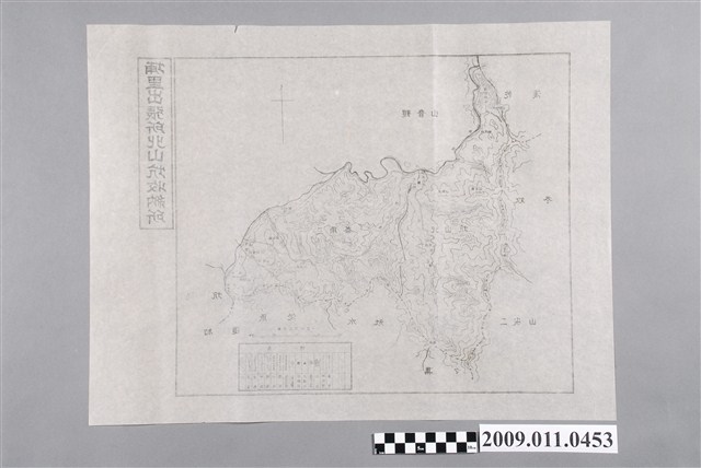 臺灣總督府專賣局〈五萬分一埔里出張所北山坑收納所〉,五萬分一等高線圖,為製腦地域圖。有指北標示。圖面範圍為觀音山、乾溪、三角崙、北山坑、双冬、過坑、加道、魚池、水社、集集、二尖山等地區,即今北山坑溪、種瓜溪與南溪(今南港溪)匯流口一帶,即今南投埔里以西的區域,標示有北山坑收納所位置,除稜線、河川、州界、郡界、道路的標示外,並標示出製腦地界、出張所及監督所、收納所、巡視所、警察所在地(駐在所或派出所)、林班界、蕃界等樟腦產業情形,從圖面可以觀察出當時製腦的分界線大致是沿著稜線、河川等自然界線劃分。