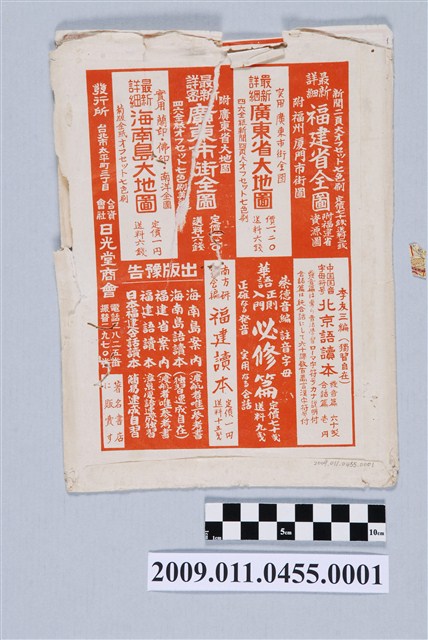 封套正面印有圖名「最新詳細海南島大地圖」,註記為實用之「蘭印佛印南洋全圖」,附有「海口市街圖」及「西沙島位置圖」,發行所合資會社日光堂商會(臺北市太平町三丁目二十八番地)。定價1元。背面為出版目錄廣告頁。封套有嚴重破損情形。
