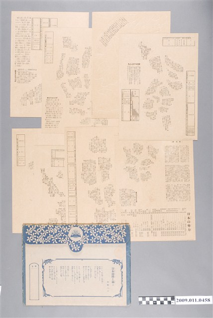 外附有地圖封套1個,地圖封套內頁印有「この板地圖は日本の地理を一番面白く覺えさせてくれるものです」、「日本の地理を覺えることは,私達の樂しい愛國運動です」2句標語及相關說明,顯現出當時對日本地理的認識,是一種愛國運動的象徵。地圖封套底則為西條八十撰寫之「日本地圖を謳フ」詩,歌頌日本地圖所列之八大地方。