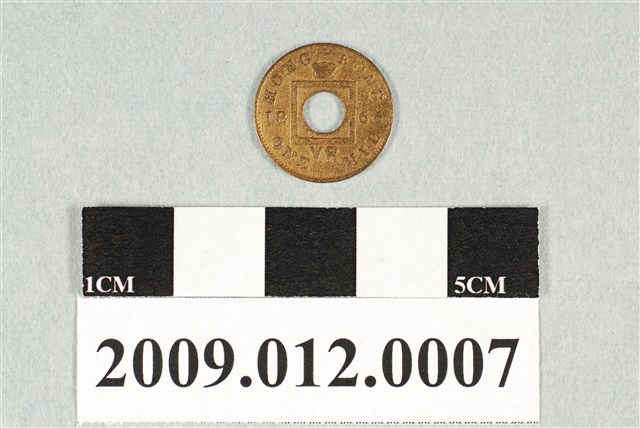 1.本物件為1866年製造面額一文的英屬香港錢幣。錢幣以青銅為主要材質,直徑約1.5公分,呈正圓形,正、背面外圍均鐫點狀幣邊;中央有一圓孔,圓孔外鐫正方形凸框包圍圓孔。銅幣正面自左上至右上以順時針方向環鐫「HONG—KONG」英文,顯示錢幣使用地區為香港,其中「—」符號位於錢幣正上部。錢幣左下和右下兩部分,各以逆時針鐫「ONE」、「MIL」英文字,顯示錢幣面額為一文。錢幣正左和正右各鐫「18」、「66」兩數字,顯示鑄造年代。中央方框上方和「一」符號間鐫皇冠圖案,方框下方鐫「VR」,為當時英國在位的維多利亞女王拉丁文簡稱(Victoria Regina)。銅幣背面中央方框上、下、右、左,依序鐫漢字「香」、「港」、「一」、「千」。2.1841年英國殖民香港,初期並未發行香港專屬貨幣。1863年,英國開始在香港發行面額「一文」的專屬錢幣,由位於英國倫敦的皇家鑄造廠負責鑄造。一文硬幣是是香港史上面額最低的貨幣,等同於0.001元。1866年,英國政府把面額名稱「一文」改為「一千」,意指一元的千分之一,本物件「香港一千」銅幣,即該年度的產物。