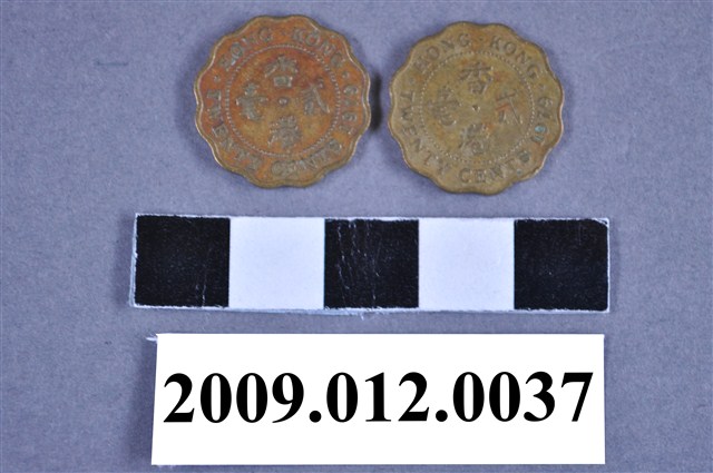 1.本兩物件均為1979年製造面額貳毫的英屬香港錢幣。錢幣材質為黃銅與鎳合金鑄造,直徑約2公分,呈12角波浪形黃銅色,正、背面幣緣均有凸邊設計,幣邊平滑。銅幣正面中央鐫在位的伊莉莎白二世女王面朝左肖像;自左下緣至右下緣以順時針方向環鐫「QUEEN ELIZABETH THE SECOND」英文,即伊莉莎白二世女王稱號。硬幣背面環鐫點狀內環形成內圈與外環,內圈正中央設計1個凸點,內圈上、下、右、左依次以漢字鐫「香港貳毫」字樣;外環左、右略偏上側各設計由上而下2-3-2排名之7個凸點,上外環以順時針方向環鐫「HONG-KONG」英文,顯示錢幣使用地區為香港,其中「—」符號位於錢幣正上部。下外環以逆時針方向環鐫「TWENTY CENTS 1979」,顯示錢幣面額為20仙(即2毫),以及鑄造年代。2.1841年英國開始殖民香港,初期並未發行香港專屬貨幣。1863年,英國開始在香港發行專屬錢幣;1866年首度發行面額貳毫的錢幣,由位於英國倫敦的皇家鑄造廠負責鑄造。貳毫等同於0.2元。本物件「香港貳毫」版型錢幣,始鑄於1975年,最後一批鑄造於1983年。