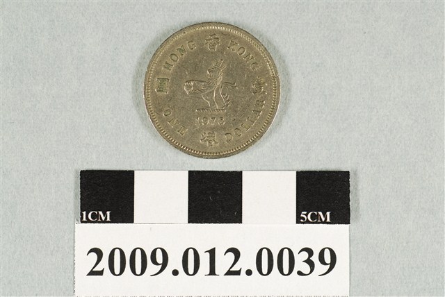1.本物件是1978年製造之面額壹圓英屬香港錢幣。錢幣材質為紅銅與鎳合金鑄造,直徑約2.5公分,呈圓形,正、背面幣緣均有凸邊設計,幣邊為齒狀。銅幣正面中央鐫在位的伊莉莎白二世女王面朝左肖像;自左下緣至右下緣以順時針方向環鐫「QUEEN ELIZABETH THE SECOND」英文,即伊莉莎白二世女王稱號。硬幣背面正中央鐫手持珍珠的英國皇室獅子圖案,圖案下方鐫「1978」,以示鑄造年代;錢幣上、下、右、左等面依次以漢字鐫「香」、「港」、「壹」、「圓」字樣;左上、右上依次鐫「HONG」「KONG」之香港英文,左下、右下依次鐫「ONE」、「DOLLAR」之一圓英文。2.1841年英國開始殖民香港,初期並未發行香港專屬貨幣。1863年,英國開始在香港發行專屬錢幣;1866年首度發行面額壹圓的錢幣,由香港造幣廠負責鑄造。1868年,香港造幣廠結束營業,港府也停止鑄造壹圓面額硬幣。1960年起,港府再重新鑄造壹圓硬幣。本物件「香港壹圓」版型錢幣,始鑄於1978年,最後一批鑄造於1980年。