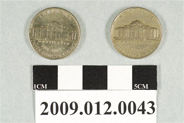 1.本兩物件是1946年和1994年製造之面額5分(等於0.05美元)之美國錢幣。錢幣材質銅佔75%、鎳佔25%。直徑約2.1公分,呈圓形,正、背面幣緣均有凸邊設計,幣邊平滑。錢幣正面中央鐫美國第3任總統傑佛遜(Thomas Jefferson)面朝右肖像;肖像左方靠近幣緣處以順時針方向鐫「IN GOD WE TRUST」英文,中文意指「我們信仰上帝」;1946年版錢幣肖像右方自幣緣開始以順時針鐫「LIBERTY‧1946」;1994年錢幣則在同位置鐫「LIBERTY‧1994D」字樣,LIBERTY英文指的是「自由」之意,數字代表製造年代,D指的是丹佛造幣廠製造。硬幣背面中央鐫傑佛遜總統位於美國維吉尼亞州的故居蒙蒂塞洛之圖案,圖案下方鐫「MONTICELLO」,為蒙蒂塞洛之英文,1946年版錢幣圖案右方靠近幣緣有「S」字樣,表示錢幣為舊金山造幣廠製造;蒙蒂塞洛英文字樣下方以逆時針方向鐫「FIVE CENTS」英文,表示硬幣的面額為5分;硬幣下緣以逆時針方向鐫「UNITED STATES OF AMERICA」英文,以示美國的國號全稱;上緣以順時針方向鐫「E PLURIBUS UNUM」英文,意指「合眾為一」,為美國國徽上的格言。2.美國在1776年獨立建國,1792年成立美國鑄幣局(United States Mint),負責製造流通貨幣。1866年,美國政府首度發行面額5美分的硬幣。本物件以傑佛遜作為頭像的5美分硬幣始鑄於1938年,最後一批鑄造年分是2004年。2006年,美國雖然恢復鑄造傑佛遜肖像和蒙蒂塞洛圖案的5美分貨幣,但傑佛遜的肖像改為正面。