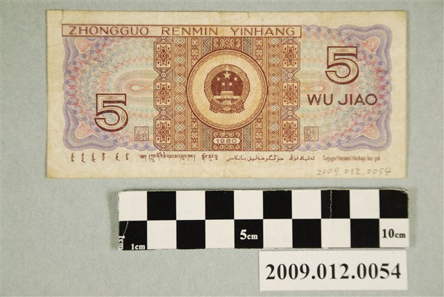 1.本物件為版刻年代1980年中國人民銀行發行的面額伍角人民幣鈔票。以紫紅色為主墨色,採橫式印製,長約5.8公分、寬約12.5公分,採用正反雙面凹印。鈔票正面圍成咖啡底色幾何花紋方框,方框內塗滿紫紅底色幾何花紋底圖;框內左側由左而右繪製苗族和壯族人物面朝左圖像;方框左下角覆繪幾何花紋底圖,底圖覆寫空心「5」字;方框右下角覆寫空心「5」字樣;圖像下側印有紅色「CP87556249」編號。正面中央右側繪製由內而外顏色由深而淺的咖啡色幾何花紋同心圓框,圓框中央由左而右覆寫空心「伍角」兩字;外圍咖啡色方框在右上框線處留白,空白處由左而右以簡體字書寫「中国人民银行」等6字。鈔票背面中央繪製咖啡色花紋方形圖案,圖案設計咖啡色、橘色相間同心圓圓框,圓框正中央繪製咖啡色中華人民共和國國徽;圓框下方方框內繪製扁六角形框,框內書寫「1980」字樣。背面左、右兩側各繪製彩色幾何花紋底圖,左底圖中央偏下方處覆寫咖啡色空心「5」字樣,底圖右下處印有篆體中國人民銀行「行長之章」方形戳印;右底圖中央偏上處亦覆寫咖啡色空心「5」字樣,底圖中央由左而右覆寫「WU JIAO」之面額漢語拼音,底圖左下部印有篆體中國人民銀行「副行長章」方形戳印。自背面左上角至中央往右繪製咖啡色長方框,框內由左而右書寫「ZHONGGUO RENMIN YINHANG」字樣,為中國人民銀行之漢語拼音。方框下方空白處由左而右分別以蒙文、藏文、維吾爾文、壯文等4個文字版本書寫中國人民銀行五角字樣。2.1948年中國人民銀行成立,並在同年發行首批人民幣。次年,中國人民銀行逐步接收原中華民國政府中央印製廠、中央造幣廠的設備,並在中華人民共和國宣布成立後,設立隸屬中國人民銀行的印刷管理局(今中國印鈔造幣總公司),負責印鈔造幣任務。本物件伍角人民幣鈔票為中國政府所發行的第四套人民幣,其於1987年4月27日正式發行,2018年5月1日開始只收不付。