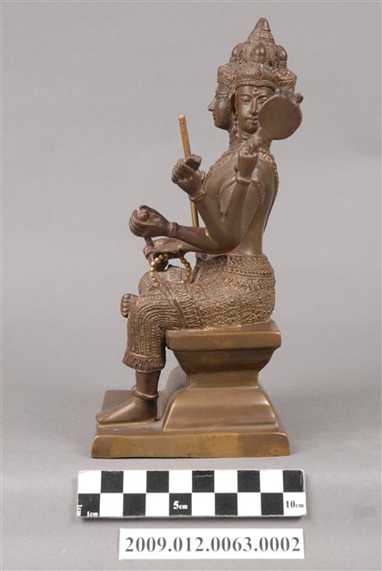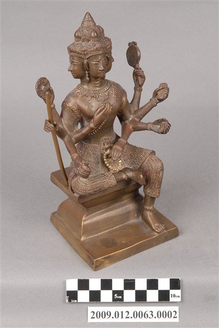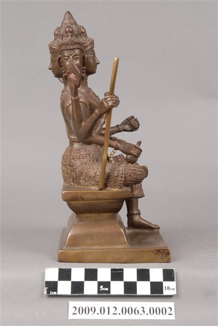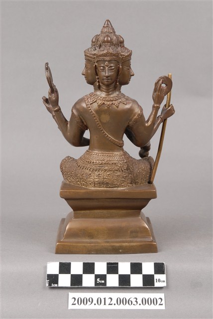 本件為金屬製四面佛神像,銅合金。四面佛,人身四顆頭臉八隻手,手各執念珠、權杖、水壺、法輪等等。坐姿採舒坐,左腳自然下垂、右腳盤起。四面佛即為梵天,在印度教中,被尊為「造物主」、「創造之神」,與毗濕奴、濕婆並列為三大主神。在東南亞的泰國、柬埔寨、臺灣等地可見到供奉四面佛,此四面代表能賜福功名、感情、財富、健康等好運。
