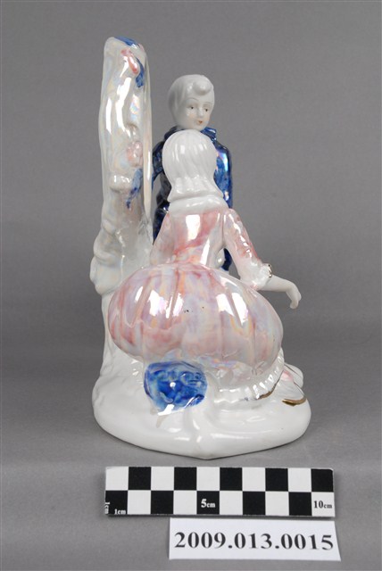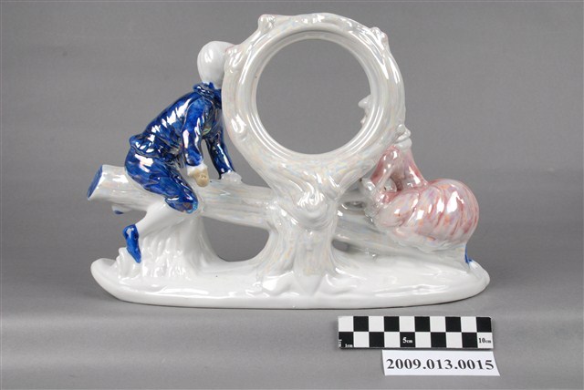1.本件為珠光彩釉西洋男女蹺蹺板時鐘飾框,飾框的造型具有巧思,男仕與仕女各乘坐在翹翹板一端隔空對視,仕女穿著澎裙,坐在翹翹板時裙擺澎起呈圓球體,宛如坐在翹翹板時迎風吹起的狀態。男女中間有一圓形框邊,其用途是為讓訂製者鑲入時鐘之用。男仕左手扶著翹翹板,右手中間有孔,可知原來應有其他組裝細節。全器施釉,並繪顏彩,顏彩用細筆描繪出瓷偶的眉毛和睫毛,以小圓點點出眼珠,整體五官對齊,不但捕捉了兩人對視的表情,亦顯得此器的做工精緻。男仕以釉下青花填彩;仕女則填粉色釉,色釉之上又施珠光彩釉,使全器色澤豔麗,具有如彩虹般多變化的視覺效果。珠光釉上,在瓷偶的袖口及底座上亦描金裝飾。整體細節豐富,為華麗而精巧的作品。 2.臺灣生產裝飾陶瓷崛起於1970年代,由日本移轉生產技術而來。當時政府鼓勵產業外銷,促使裝飾陶瓷大量生產,也讓臺灣進軍國際,成為陶瓷外銷國。裝飾陶瓷以外銷歐美為導向,主要的經營方式是委外代工,不但是接收國外訂單、運用國外的設計,甚至也進口國外原料。苗栗的裝飾陶瓷憑據接收外銷訂單,創造了許多就業機會,帶動了地方產業發展。