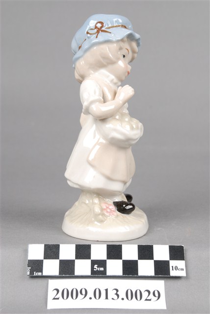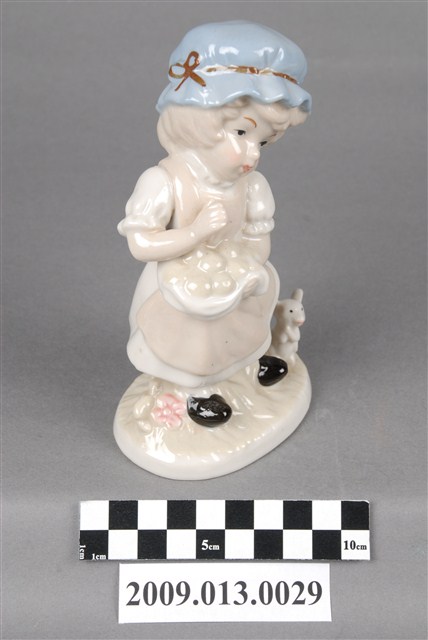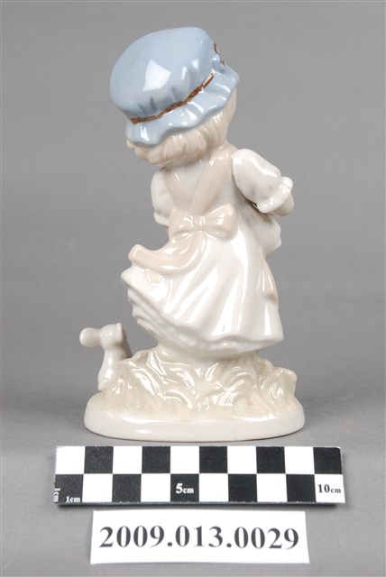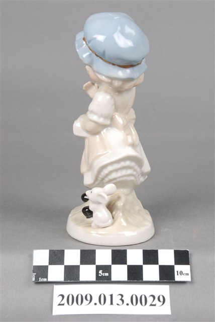 1.本件是苗栗地區產製之彩繪女孩與鼠陶瓷玩偶,女孩戴粉藍色圓帽,著白淺褐色洋裝,外裙聚攏成一口袋,內裝著碩圓果子,腳下一鼠作祈求姿勢,女孩則低頭俯瞰老鼠作拒絕手勢,呈現兩者之間逗趣的互動狀態。全器施釉,釉面晶瑩光澤,除女孩帽子上的褐彩絲帶及顏彩的描繪為釉上彩繪之外,以釉下彩為主要繪彩方式,淡藍色及淺褐色則為主色調,色調淺淡柔和。 2.釉下彩是將色料填於素胚上,罩上透明釉後入窯以高溫1250度燒製而成。燒出的釉面平滑有光澤,使用的顏料除了鈷藍屬於較重彩之外,使用色調偏淺淡,整體風格較為雅致。在苗栗地區的裝飾陶瓷產業中亦有以生產釉下彩繪裝飾陶瓷而知名的工廠,如「軒宇陶瓷公司」及「元好陶瓷公司」即屬之。