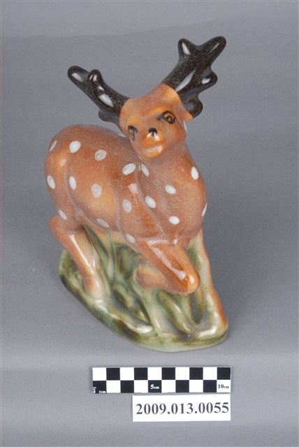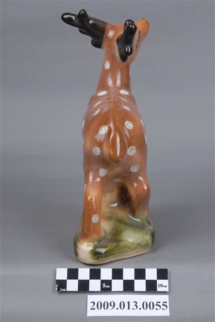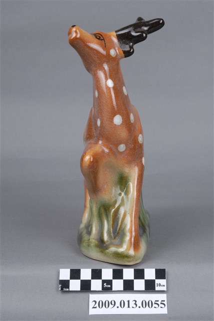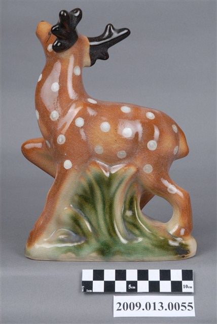 1.本件臺灣鶯歌窯梅花鹿裝飾陶瓷主要作觀賞擺飾用途,通身以白色瓷土製作,採石膏模注漿灌模塑形。其表面施以各色釉料燒製完成。擺飾以梅花鹿為造型,其姿態作右前肢抬起彎曲狀,另外三隻腳作站立狀,鹿頭偏右向上抬起,底座為草地造型。梅花鹿身軀以淺褐色底色,帶有白色點狀斑點,鹿角與耳朵為深褐色,底座草地以綠色裝飾。