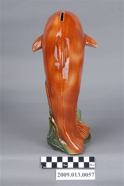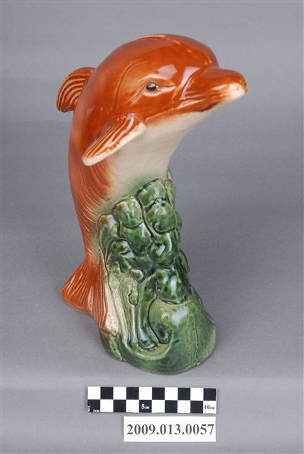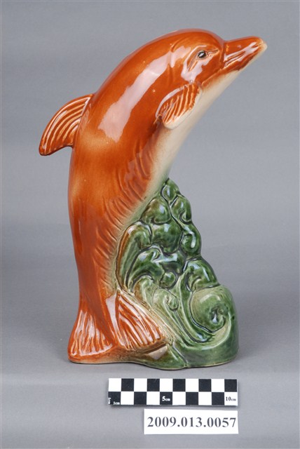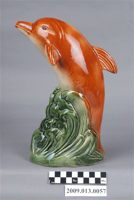 1.本件臺灣鶯歌窯褐綠釉海豚造型存錢筒主要作觀賞擺飾與儲蓄用途,通身以瓷土製作,採石膏模注漿灌模塑形,於海豚表面以空氣噴槍施以褐色釉料,底座施以綠色釉料後燒製完成。本件裝飾陶瓷外型以海豚為造型,其姿態呈頭上尾下之躍出水面狀,身軀作弧形,身軀腹部為白色,其餘皆為褐色。底座外觀作捲起波浪紋路,表面帶有深淺漸層綠色。另外頭頂開有直式細長的長方形孔,作錢幣投入孔。2.裝飾陶瓷泛指不具實用功能、僅作擺飾之用的瓷器,又稱作「西洋藝術陶瓷」或「西洋玩偶」。裝飾陶瓷著重寫實細膩的手繪技巧、色彩鮮艷、精巧細緻供人賞玩收藏
