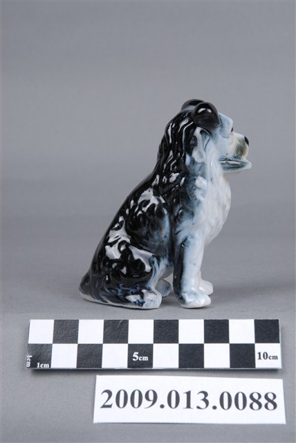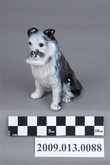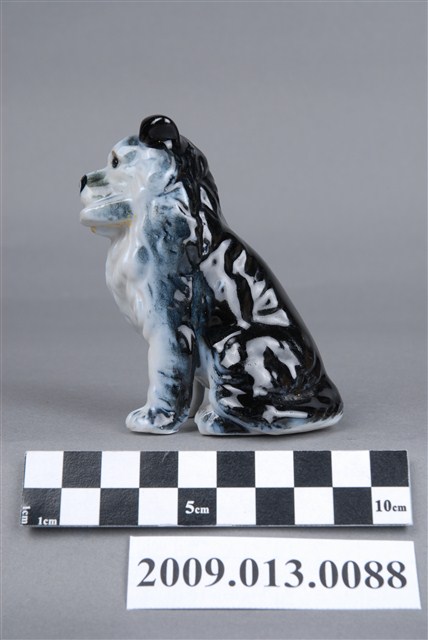 1.本件為苗栗地區生產之青花信差狗造型擺飾,以注漿模製成型,小狗咬著書信立坐,展現胸前蓬鬆毛髮,眉宇及眼珠有繪彩,姿態與表情乖巧順從。小狗全身施釉,釉面光潔均勻,上噴繪濃重青色釉下彩,色彩集中小狗背部,臉部、胸前、前腳等釉彩與白瓷交接之處可見噴彩特有的漸層效果。2.裝飾陶瓷又稱為西洋玩偶,這類玩偶產品以外銷歐美為導向,在臺灣以苗栗公館為生產重鎮。玩偶的繪彩方式不只有使用毛筆上彩一種,有時需要呈現色彩暈染或漸層效果,亦需用噴槍的方式繪彩。此外,使用噴槍繪彩也較快速,有利於大量生產,因此廣用於動物造型的裝飾陶瓷。