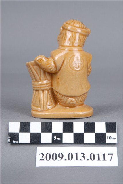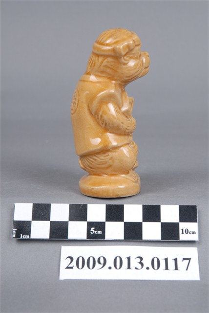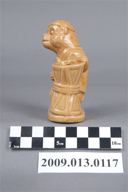 1.本件鶯歌窯褐釉猴形燭臺兼具實用與觀賞用途,通身以瓷土製作,採灌模塑形,於表面施以淺褐色釉料後燒製完成。燭臺造型為日式風格,以蹲坐擬人猴子為主,頂戴頭帶,身穿日式服裝,背面印有壽字,手持日本國徽摺扇。一旁裝飾有桶胴太鼓,太鼓頂面開圓形口,為蠟燭放置處。2.鶯歌窯業肇始年代明確可考為1804年福建泉州磁灶人吳鞍渡海來臺,於鶯歌築窯製陶,為鶯歌陶瓷之始。最早燒製磚瓦開始,逐漸發展傳統的日用粗陶器,包括陶缽、陶甕、茶壺、龍罐、香爐、金斗甕、狗母鍋、醬菜甕等器物,1960年代開始發展精緻陶瓷產品。