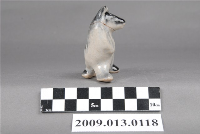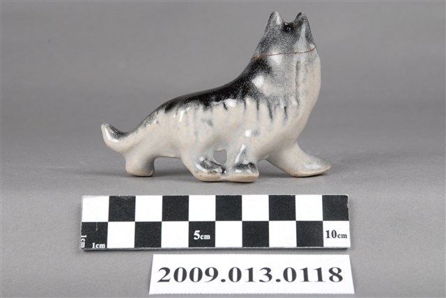 1.本件臺灣鶯歌窯牧羊犬造型裝飾陶瓷主要作觀賞擺飾用途,通身以瓷土製作,採石膏模注漿灌模塑形,於表面施以白色厚釉,另於頭部、耳朵與背部點綴黑色釉料。本件裝飾陶瓷外型作長毛牧羊犬造型,姿態作略為半蹲伏地狀,右側前後腳相連,左側前後腳則各自向前後處延伸,尾巴略為向上翹起。頭部抬起左偏。本件擺飾頸部帶有一圈斷裂痕跡,後以膠水修補,裂紋處膠水現已裂化呈黃褐色。2.鶯歌窯業肇始年代明確可考為 1804 年福建泉州磁灶人吳鞍渡海來臺,於鶯歌築窯製陶,為鶯歌陶瓷之始。最早燒製磚瓦開始,逐漸發展傳統的日用粗陶器,包括陶