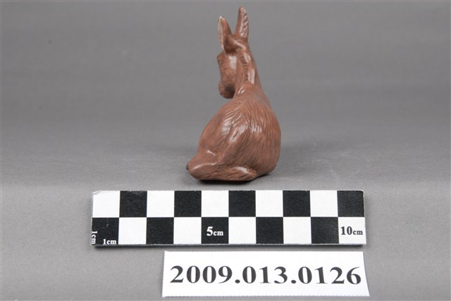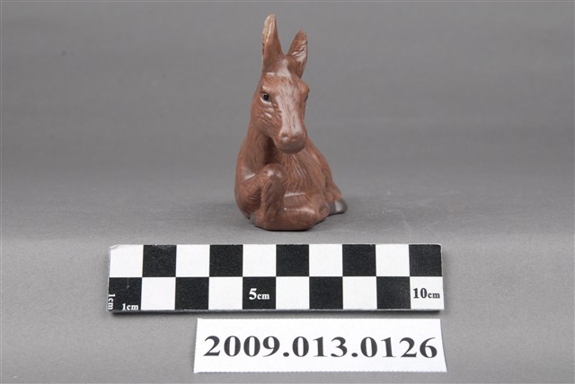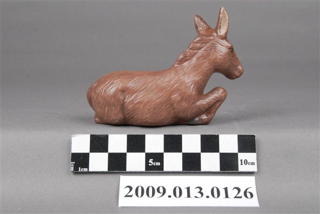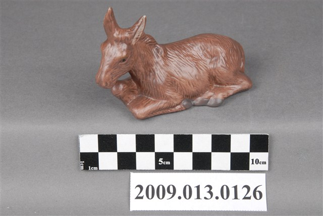 1.本件褐釉驢型裝飾陶瓷主要作觀賞擺飾用途,通身以瓷土製作,採石膏模注漿灌模塑形,於表面施以粉彩褐釉,毛髮刻畫細緻。另於腳蹄、眼睛點綴黑色與咖啡色釉料。本件裝飾陶瓷外型作驢造型,姿態作側躺立身樣式,四肢蜷縮於底,右前腳略為扶地,耳部作立耳樣式,頭部略為偏轉,直視前方。2.裝飾陶瓷泛指不具實用功能、僅作擺飾之用的瓷器,又稱作「西洋藝術陶瓷」或「西洋玩偶」。裝飾陶瓷著重寫實細膩的手繪技巧、色彩鮮艷、精巧細緻供人賞玩收藏,產品造形種類包括小玩偶、動物、卡通塑像、花卉、瓶飾等,以歐、美、日風格的瓷偶居多。由於裝