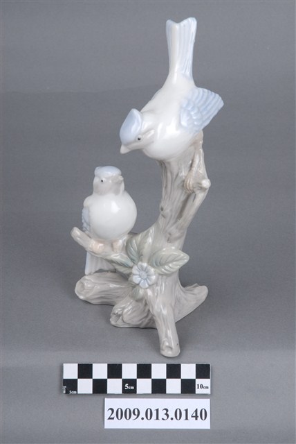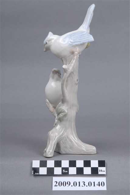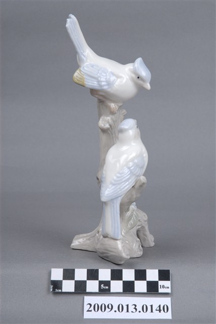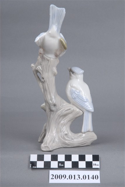 1.本件為釉下彩繪雙雀擺飾,兩隻雀鳥翅膀收起,露出圓鼓腹部,分立於高低兩側樹枝上對望,頗具小型禽鳥輕巧的神態。整體造型刻劃細緻且注重細節,無論是樹幹上粗細交錯的木紋,或是禽鳥的腳爪橫紋皆有呈現。施釉下彩,釉面平滑有光澤。釉彩以淺藍色及淺褐色為主,色調淺淡雅緻。2.釉下彩以高溫1250度燒製,燒出的釉面平滑有光澤。以釉下彩生產的產品因有高溫顏料的限制,因此通常不追求呈色鮮艷,而擁抱淡雅精緻的風格。「軒宇陶瓷公司」及「元好陶瓷公司」是苗栗地區以生產釉下彩繪裝飾陶瓷而知名的工廠。