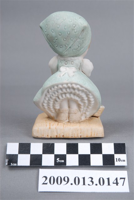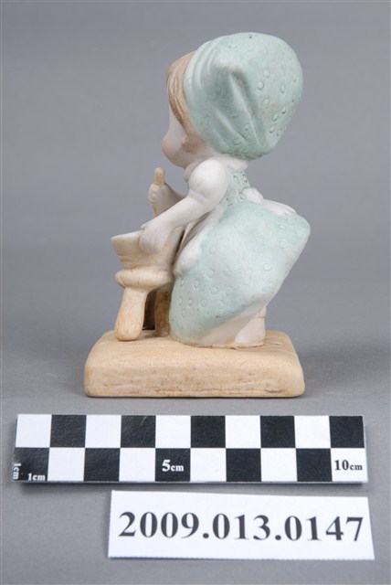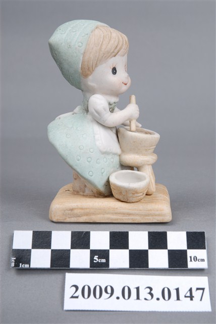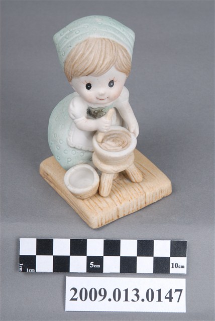 1.粉彩烹飪孩童陶瓷娃娃,女孩戴頭巾,穿圍裙,向下曲身做攪拌。女孩頭巾與洋裝上有小圈形狀之刻紋裝飾,湯缽臺座及底座則有直線刻紋,女孩後方裙擺撩起,內有層層波浪線條貼塑成蕾絲裙,頗具裝飾性。瓷偶以注漿模製而成,以釉上彩施釉填色繪彩,設色以淡湖水綠及淡茶色為主,色調粉嫩淺淡,襯托出女孩清新氣質。2.裝飾陶瓷的製作過程相當複雜,從製模注漿、取胚、修胚,到接黏、整合、上彩、窯燒,都需要人力緊密照顧製作。因此裝飾陶瓷工廠不但是勞力密集的產業,有些工廠甚至更偏向聘請女性員工,以確保能勝任此項必須具備細心與耐心的工作。
