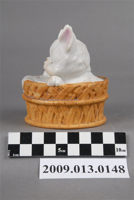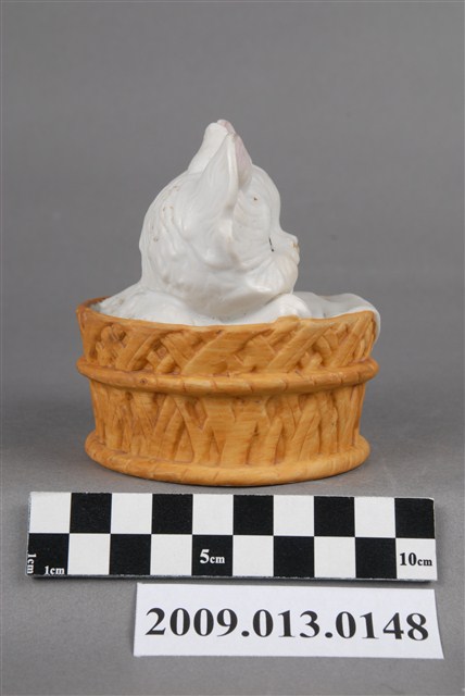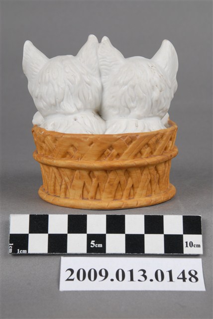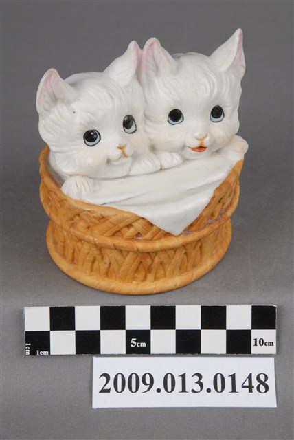 1.本件為彩繪籃中雙貓造型擺飾,兩隻白貓坐於籃子內,前腳趴在籃子邊緣,模樣生動可愛。貓咪身軀以許多曲線交錯,刻畫出起伏,營造貓咪毛髮豐絨的樣貌。籃子造型以泥條交錯編出,模仿編織籃子的質感。以釉上彩繪製籃子與貓咪五官,釉色鮮艷。貓耳則以噴繪方式繪彩,粉色釉彩漸層效果有如動物柔順的細毛一般。2.裝飾陶瓷又稱為西洋玩偶,這類玩偶產品以外銷歐美為導向,在臺灣以苗栗公館為生產重鎮。玩偶的繪彩方式不只有使用毛筆上彩一種,有時需要呈現色彩暈染或漸層效果,亦需用噴槍的方式繪彩。此外,使用噴槍繪彩也較快速,有利於大量生產,因此廣用於動物造型的裝飾陶瓷。
