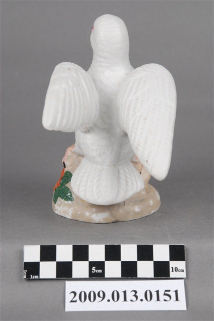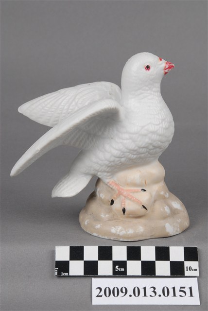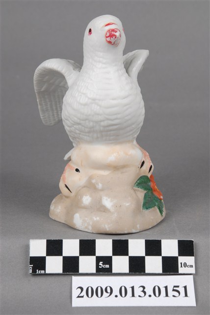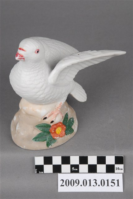 1.本件為苗栗地區產製之彩繪白鴿造型擺飾,白鴿立於花草裝飾的底座之上,昂首張開翅膀,做振翅欲飛的樣子。施釉上彩繪,鳥喙的紅釉彩及底座淡褐色釉彩有部分剝落。裝飾陶瓷的製作過程較一般實用器來的繁瑣,雖然是以注漿模製為主,但除了人像之外,鳥類的模型製作也相當複雜,需要分開製模以及黏合組裝的步驟,才能展現鳥羽拍動的生動姿態。其困難度在於,分開製模再組合時,必須顧及每個零件的比例以及造型是否正確,否則組合而成的鳥禽看起來會不夠生動自然。本件作品即是鳥身與翅膀分開製模,再拼接組合而成的精彩之作。2.苗栗裝飾陶瓷生產的類型以動物、節慶飾品、及西洋人偶為主。而為追求動物類產品能夠製作地更加寫實逼真,苗栗公館地區最大的陶瓷工廠「精華藝術陶瓷公司」甚至在廠內設立動物園,並建立動物圖片與書籍的資料庫,以便於設計師尋找靈感和揣摩。
