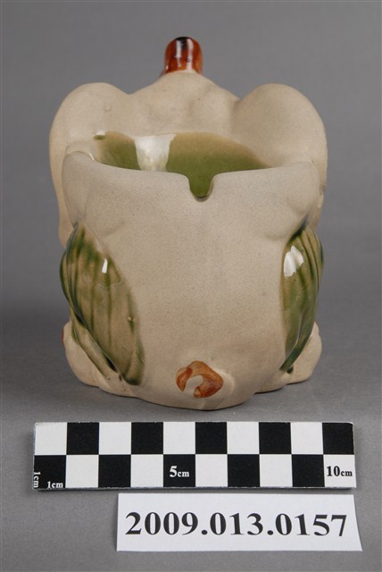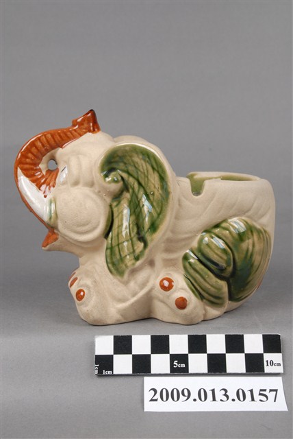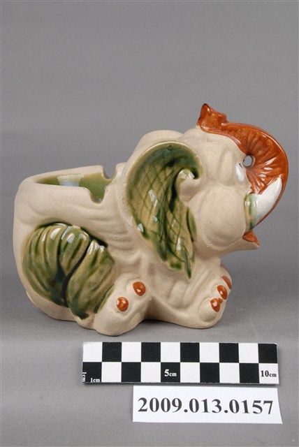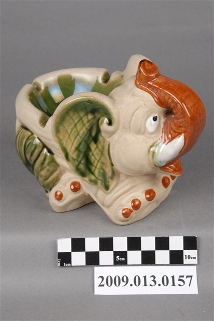 1.本物件為臺灣鶯歌瓷之燒象煙灰缸,為瓷器,為1只菸灰缸,應為鶯歌瓷,其形為大象,以泥灰色為底,搭配綠耳、綠腿、紅鼻、白牙,做工細緻,物件中間處為盤狀凹槽,用以堆放煙灰,其邊緣尚有香菸置放處凹槽。