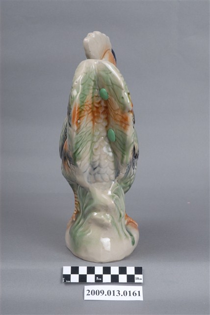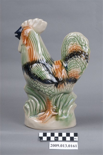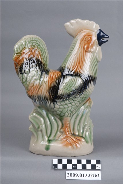 1.本件臺灣鶯歌窯彩釉公雞造型裝飾陶瓷主要作觀賞擺飾用途,通身以偏灰瓷土製作,採石膏模注漿灌模塑形,於表面施以白釉後,另以褐色、綠色與黑色釉料塗繪表面。本件裝飾陶瓷底座呈橢圓形表面刻畫綠色草地,上承公雞造型,其姿態作收翅站立狀,頭部抬起微偏右側直視前方,尾羽成弧形翹起。尾部內側右後方帶有線形的開裂痕跡,表面上下處以綠色油性黏土修補。2.鶯歌窯業肇始年代明確可考為 1804 年福建泉州磁灶人吳鞍渡海來臺,於鶯歌築窯製陶,為鶯歌陶瓷之始。最早燒製磚瓦開始,逐漸發展傳統的日用粗陶器,包括陶缽、陶甕、茶壺、龍罐