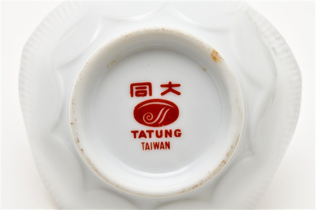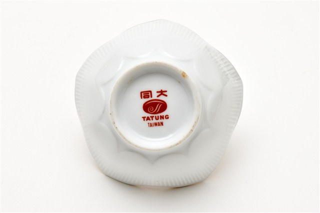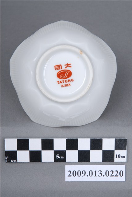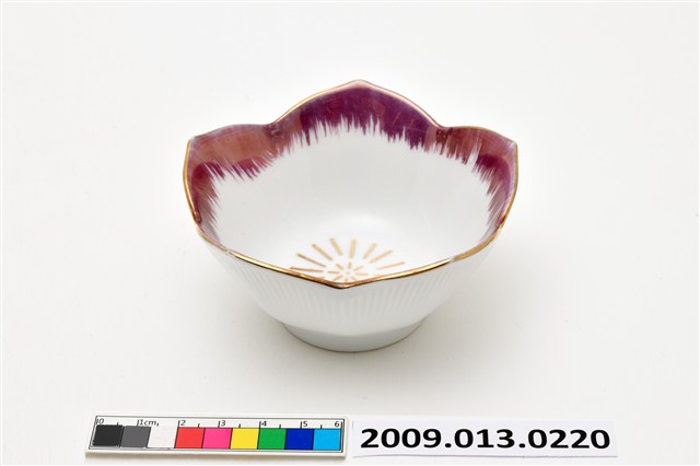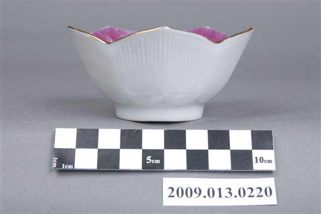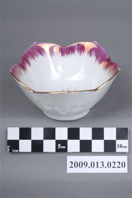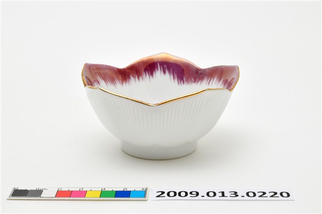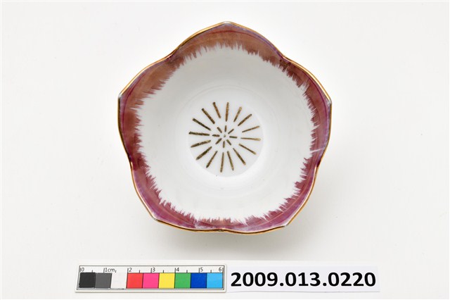 此件小碟為模印成形的瓷製器皿,花形敞口,弧壁深腹,圈足露胎。口沿以金彩描邊,內壁以乾筆沾桃紅色釉料由口沿處向碟心的方向刷繪,以筆觸變化十分巧妙地模仿真實花瓣顏色變化,碟心以金彩繪出花蕊。全器上彩方式與花口器形相結合呈一朵盛放花朵之貌,別具巧思。外壁與靠近圈足處可見模印而成的痕跡,口沿處有篦紋,圈足四周有放射狀紋路。碟底印有「大同TATUNG TAIWAN」商標,應是較為近期之作。