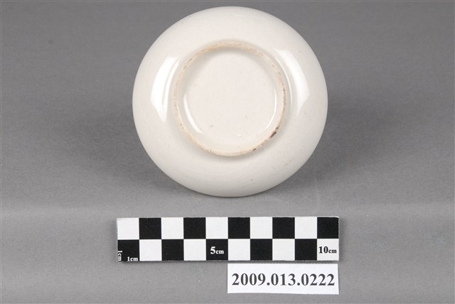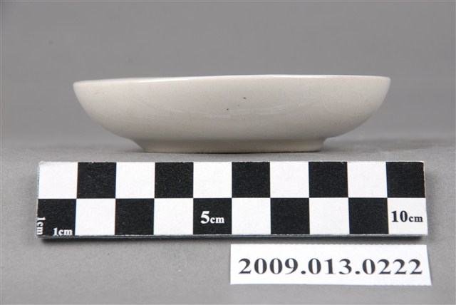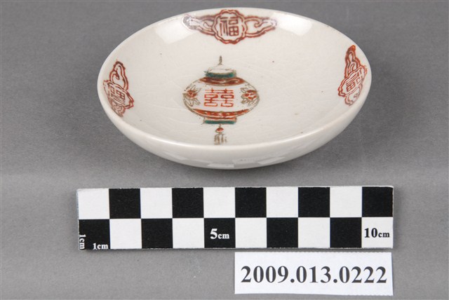 圓形醬碟,用於裝醬料。胎質粗鬆,屬於白陶質。無底款,為臺灣北投地區的產品,但窯場不詳。覆仰式鏇壓法製作,圓形器面,平底,圓腹,圓唇,淺圈足。全器施以白色化粧土後,再施透明釉,釉面有開片現象,並有針孔與色斑。在釉燒之後,以釉上彩裝飾。器緣四邊以橡皮章印花技術,沾上色料後,印上四組造形相同的鐵紅色的如意雲紋,中間各有一「福」字。器心印有金色輪廓的球形古典宮燈紋,並有「囍」吉祥文字,兩側護以寶相花紋。再以手工在宮燈上下平塗綠色與紅色的線條,並點上兩旁的花蕊,使器面色彩豐富。釉上彩繪裝飾在時間上晚於釉下彩繪,從這件作品中可以看到釉下彩印花裝飾技法繼續挪用到釉上彩的情形。