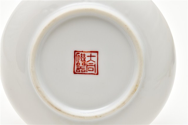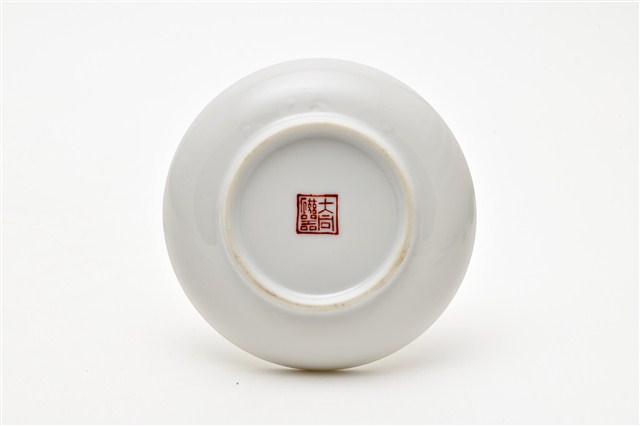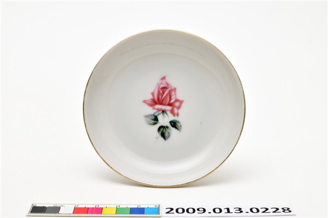 圓唇敞口,弧壁淺腹下斂至圈足,圈足露胎。全器釉色米白光滑瑩潤,口沿繪金彩弦紋,碟心以紅、綠釉轉印一含苞待放的薔薇花,濃淡有別頗具立體感,整體呈色淡雅柔和,賞心悅目。臺灣民間雖然常以薔薇花做為富貴長春之象徵意義,但少見以含苞待放的花朵為主紋飾,十分特殊。碟底印有紅色方篆體「大同磁器」方印。