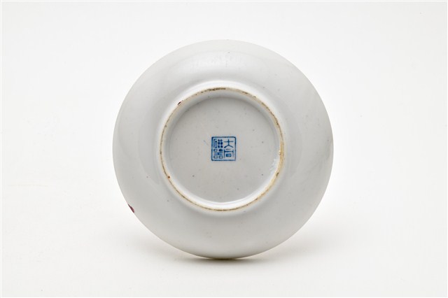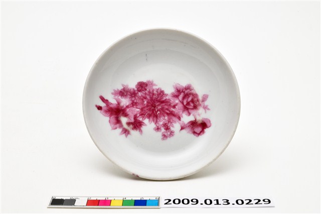 此件小碟圓唇敞口,弧壁下斂至圈足,圈足露黃胎。全器米白,僅碟心以粉紅釉轉印花卉紋裝飾。紋飾以數種花卉組合而成,如薔薇、菊花等,雖皆以紅色釉呈現,但特徵各異,刻畫仔細。全器多處可見使用痕跡,碟心有些許刮痕,口沿亦有摩擦的痕跡。碟底帶有藍色方篆體「大同磁器」方印。