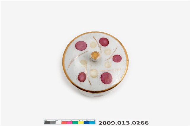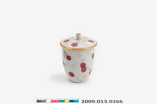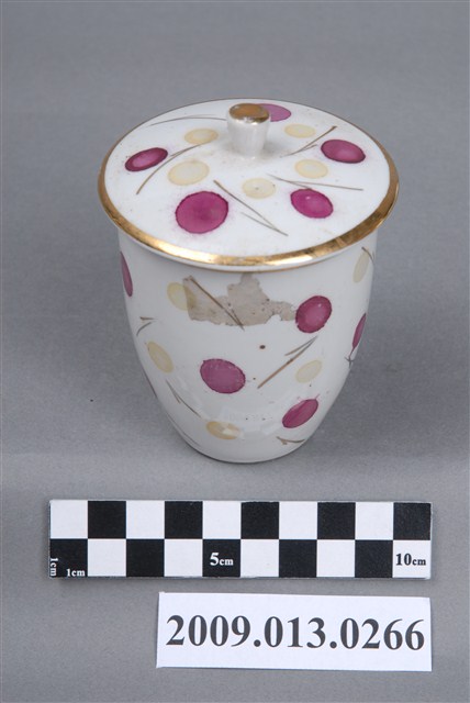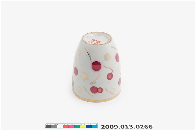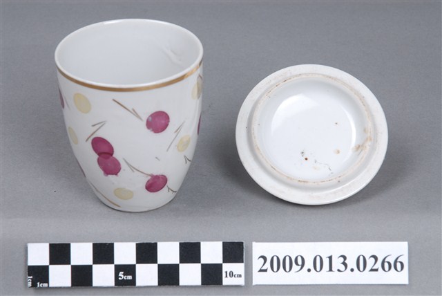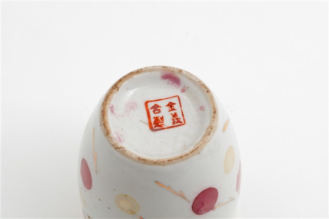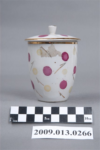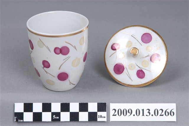 當代金義合陶瓷工藝品。器型屬於近代流行之無把高蓋杯。造型新穎,直口向杯底略縮,凹底。坯體潔白清脆,模製,通體施透明釉。釉上轉印多彩花紋,設計風格新穎,色澤飽滿,顯示近代膠板印刷轉印。杯底印款「金義合製」,可能是當代外銷工藝品或整組禮品。