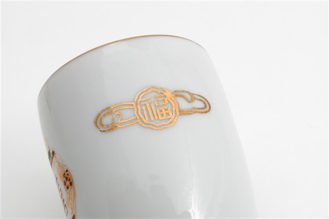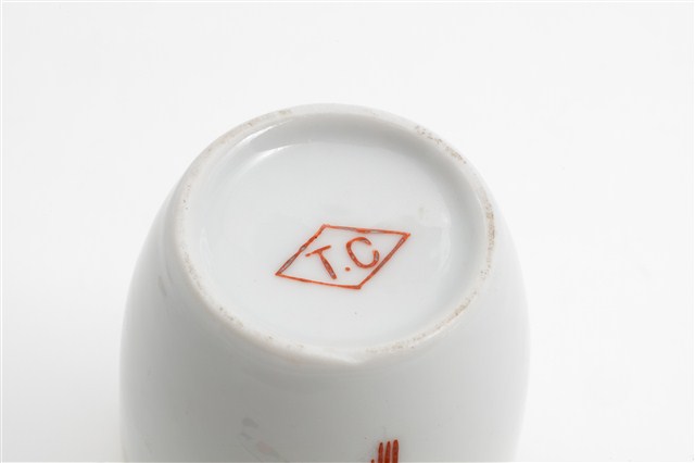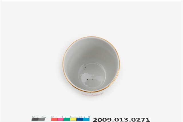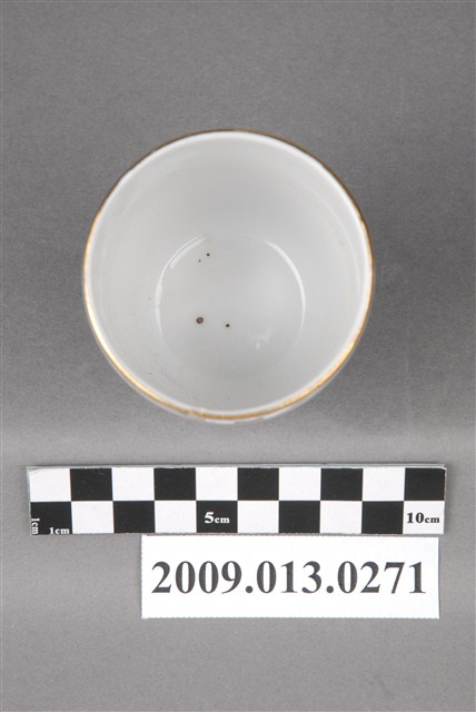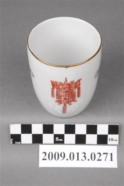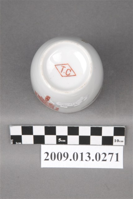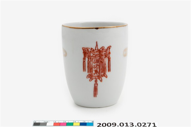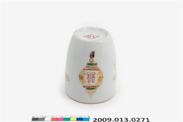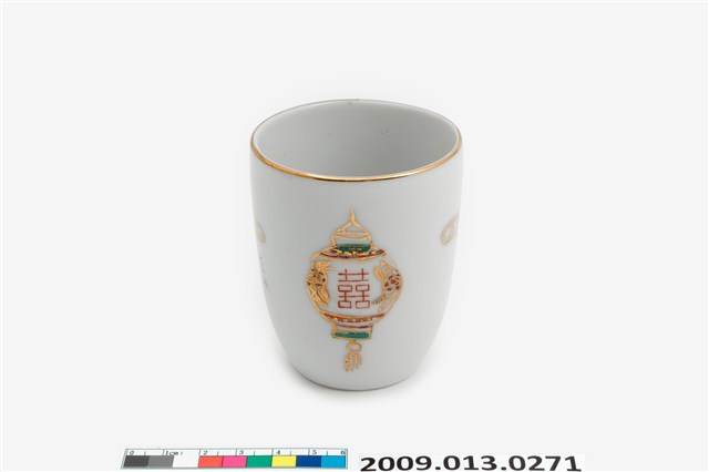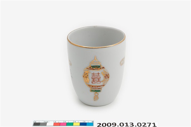 戰後1970-80年代臺灣北部窯系製品。器型屬於當代陶瓷工藝品近流行之無把高蓋杯。造型新穎,直口向杯底略縮,凹底。坯體潔白清脆,模製,通體施透明釉。杯體相對位置於釉上轉印彩繪一組宮燈圖案,包括描金勾勒燈形,燈心紅彩囍字,對面為紅彩福祿壽宮燈,期間相隔以金彩如意祥雲福字,研判是鶯歌萬華一帶製品。杯底印款「T.C」。本件紋飾顯然是以登錄號2009.013.0275之日本製品高檔附蓋茶杯為仿製對象,包括銅版轉印圖案、描金勾勒等圖案,惟年代相差約十年,精細程度也頗見差距。