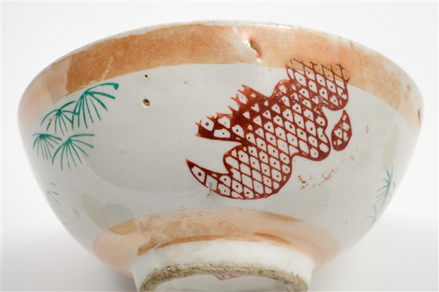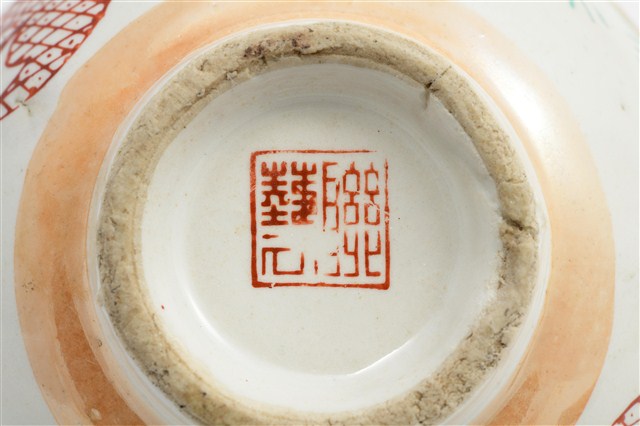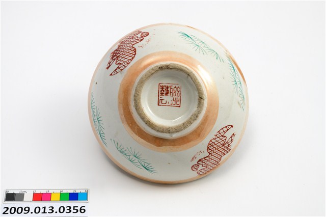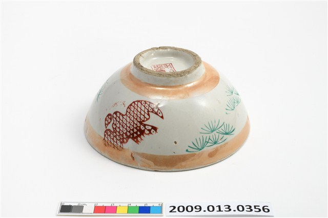 戰後初期鶯歌窯彩瓷飯碗多樣類型之一。彩瓷碗以模製成形,施罩白釉高溫燒製,再上黃閃光釉與紅綠彩裝飾二次燒製而成。全器施釉,圈足刮釉露胎,圈足有孔隙裂縫。碗內面素面無紋,潔白素淨。碗外器壁口緣與近底處施作兩道黃閃光釉金邊裝飾,器腹環繞碗身一周,裝飾兩組壽字紋與青草紋圖案,皆採用轉印紙印花技法。紅彩印花民藝書法壽字紋,綠彩印花青草紋,佈置疏朗錯落有致。紅彩部分剝落,局部可見轉印在黃閃光釉之上。口緣與器底的兩道金邊裝飾帶是所謂的閃光釉,新式釉藥金黃色閃光釉是一種低溫釉上彩,燒成溫度約攝氏七、八百度,施在白色釉藥上,會產生一種閃光的效果。研究者稱,隨著釉上彩繪的流行,鶯歌陶瓷產業開始分工化生產,若干工坊向生產碗盤的業者購買燒好釉藥但沒有彩繪的白瓷,再以電窯專門從事釉上彩的加工,這類新興的業者當地稱為「電花」業。黃色閃光釉與多彩裝飾,見證了戰後初期鶯歌陶瓷產業推陳出新的各種嘗試。該件作品外底心有正方形釉上紅彩款印,標記「聯藝」公司出品。