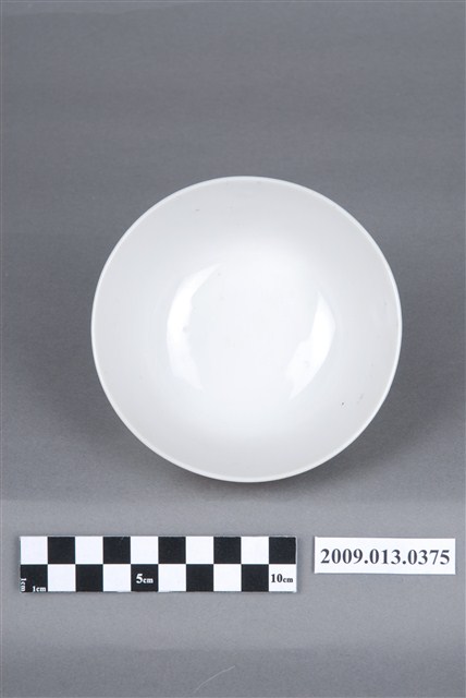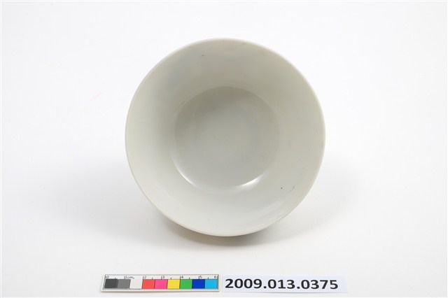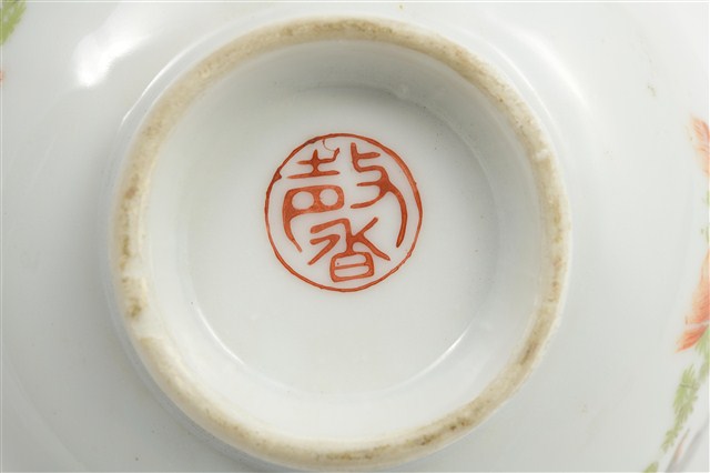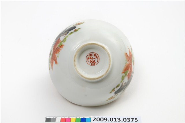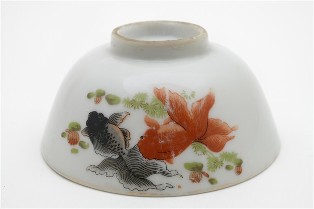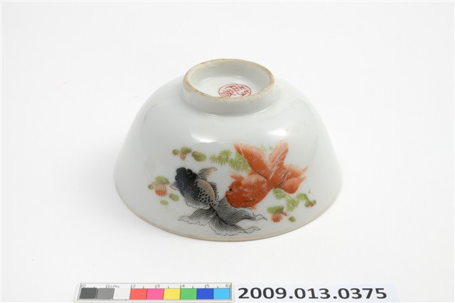 這是戰後流行的彩飾瓷技術的一大突破,作為彩繪基底的白瓷,已達西方定義標準的瓷器(porcelain)。敞口、圓弧腹、帶圈足碗,造型已是現代飯碗形制。全器滿釉,圈足刮釉露胎,胎質堅硬細緻。碗內壁素面無紋,光亮潔淨,外器壁口緣下方施作一道細細的金彩邊線,碗壁兩側以多次印刷套色技法,裝飾金魚水澡紋飾,豐碩肥美的紅彩與黑彩金魚,擺鰭搖尾自在倘佯於黛綠水草與水澡之間。魚紋,具有「年年有餘」、「吉慶有餘」的諧音吉祥意義,因此成為社會大眾喜愛的碗盤餐具的裝飾圖案之一,隨著不同時代流行碗式與技法的變化而有所發展。該碗的白瓷與如繪畫般精細的圖案,應是1968年之後至1970年代之間的產品。碗外底心落款「馨」字商號。