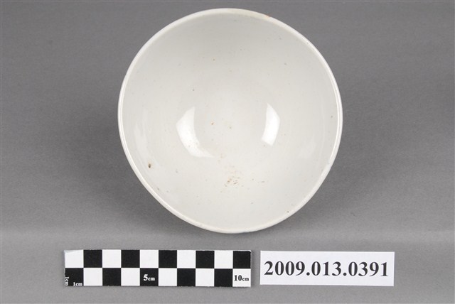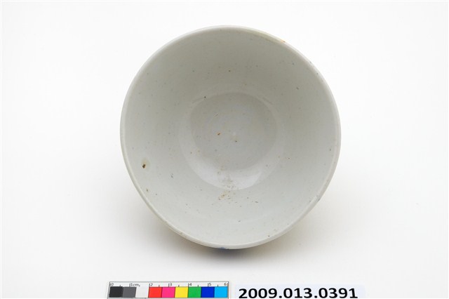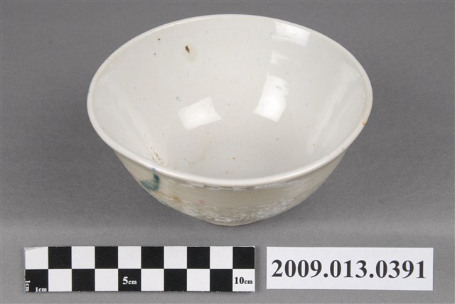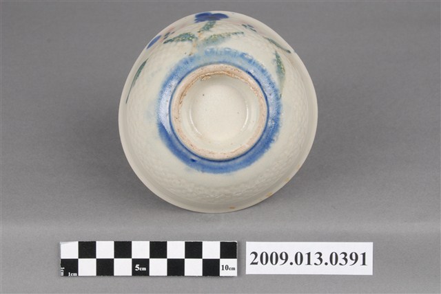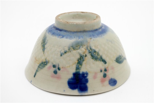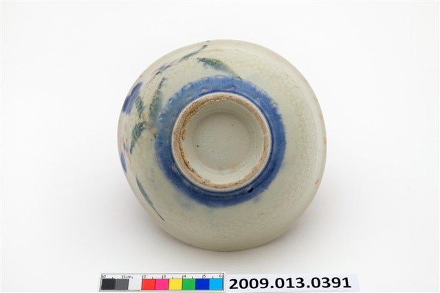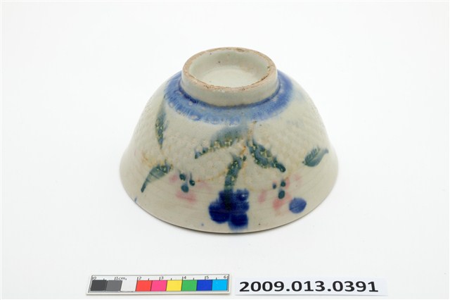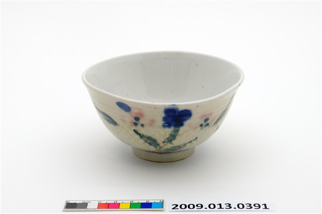 戰後初期家庭常見之釉下多彩瓷碗。微侈口、弧壁、帶圈足碗。比起同時期其他常見之敞口、弧壁寬腹的帶圈足碗,器形較為清瘦小巧。以模具成形,圈足以外,全器滿釉,底足刮釉露胎處呈黃色。內壁素面無紋,碗口呈歪斜。碗外器壁圈足上方裝飾一道寬邊青花線圈,外器壁一側以藍、綠、粉紅、黃色彩繪折枝花卉紋,採取沒骨寫意筆法,再搭配內白釉、外黃釉的底釉色彩,相當吸睛。雖然色彩鮮豔奪目,但釉彩燒製溫度控制不佳,彩釉流淌模糊。1940年代開始臺灣窯場逐漸發展釉下多彩技法,隨著化學合成釉彩推陳出新,碗盤餐具的繽紛色彩豐麗多變。其技法極直接承襲模仿日本的陶瓷工藝。該件作品胎釉燒結與釉彩發色皆良好,保存狀態亦佳,應屬戰後初期1950年代至1960年代鶯歌等臺北窯場製品。