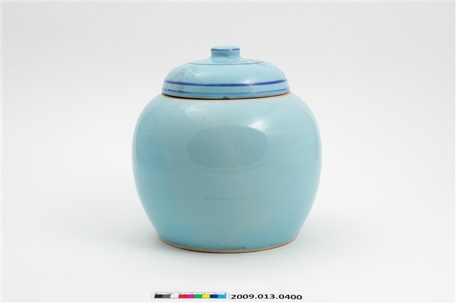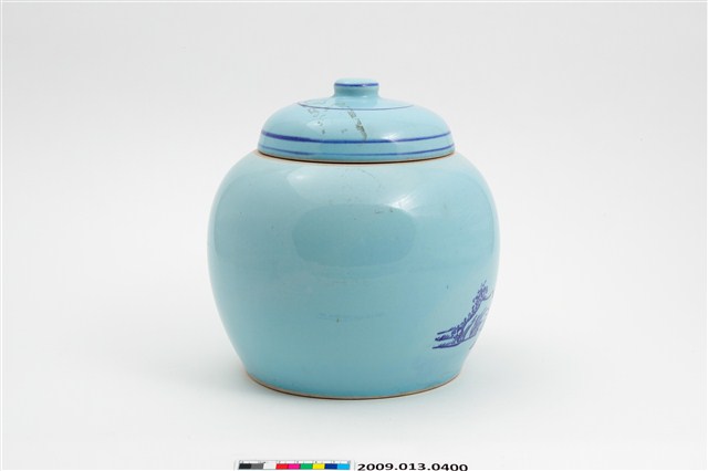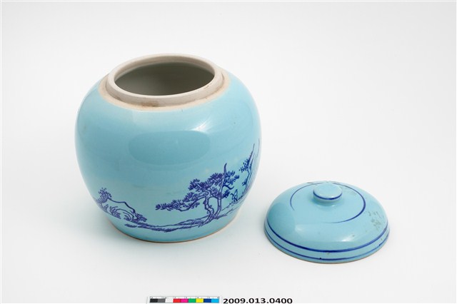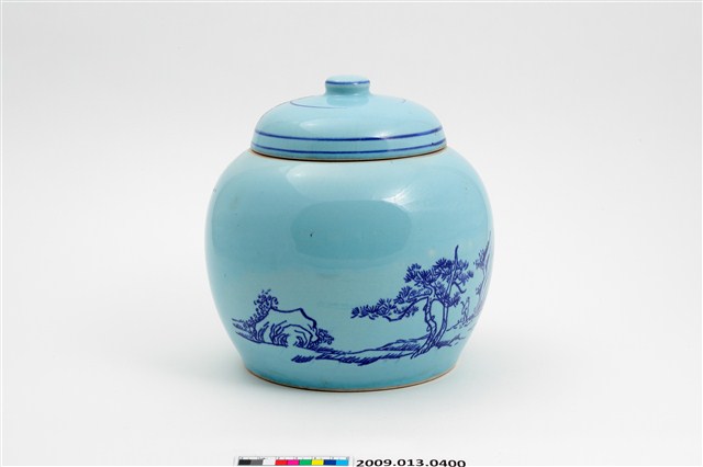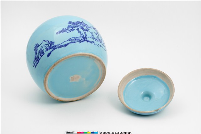 1. 廣口,平沿,削肩,圓腹,平底,圈足,圓蓋帶鈕。除器身口沿周邊與足底,以及器蓋內壁蓋沿周圍外,通體施釉。器蓋自蓋鈕以下至蓋沿,共有四道青花弦紋裝飾,器身青花紋飾則作橫卷山水,右起巖壁,一人做文士裝束,策仗向左緩行,歷雙松乃至巨石而止,岩石皴法、松木姿態、地面植披皆描繪清晰。2. 依據捐贈人莊建緒先生提供資料,該器為臺灣本地窯場產品,青花紋樣皆以印花方式繪飾,乃做為燉煮食材之用。