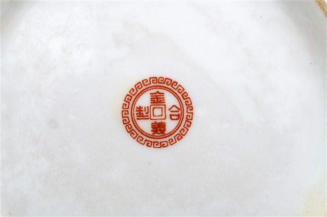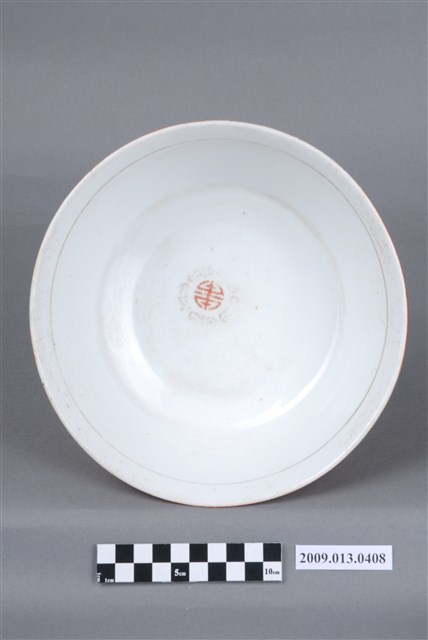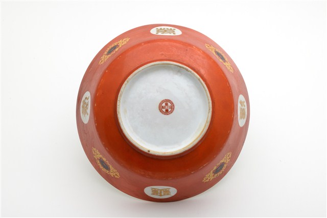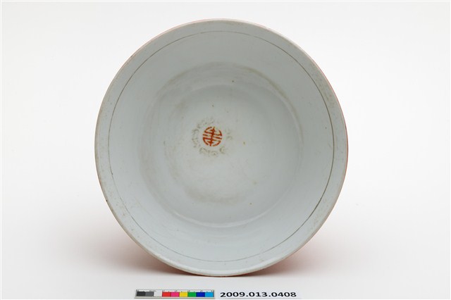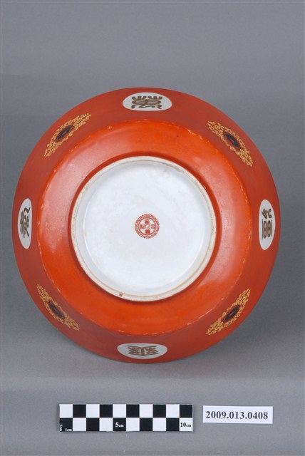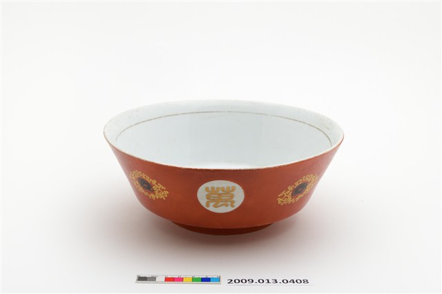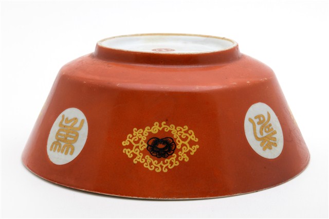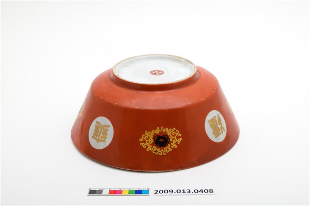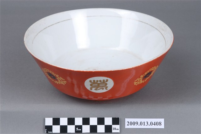 折腰碗底有紅彩「金義合製」商標。敞口、斜直腹的折腰大碗。尺寸高約7.9公分,寬約20.8公分,是特大型的湯碗。湯碗內外施罩白釉,高溫燒成之後,再低溫烤花。碗心裝飾紅色壽字與金彩花邊,近口緣處一圈細金線邊。碗外器壁施以鐵質礬紅釉,留下四組圓形開光,裝飾萬壽無疆金彩文字,四個文字之間裝飾四組相同圖案,皆為黑色花蕊飾以黃色唐草紋邊。釉上彩的引進是戰後初期陶瓷發展上的另一里程碑,業者開始研究各種色彩的應用,其中最不容易燒成的顏色就是對於溫度和窯內氣氛很敏感的以鐵為主要成分的紅色。1960年代北投、鶯歌紛紛盛行珊瑚紅、礬紅彩。萬華地區的金義合公司長期以來深受兩地陶瓷產業影響,迅速追隨流行風潮。