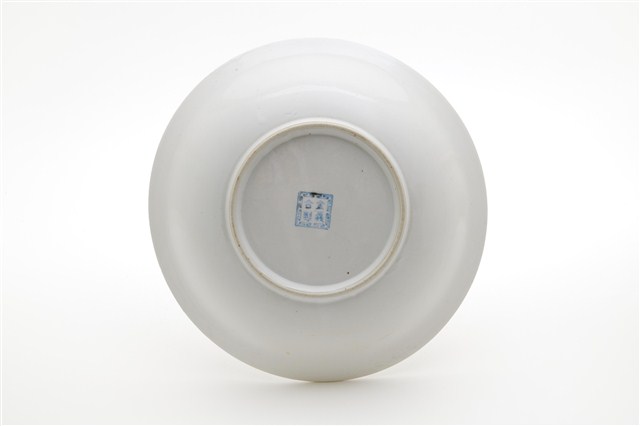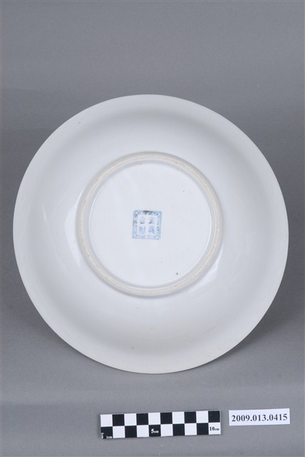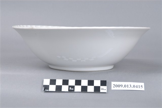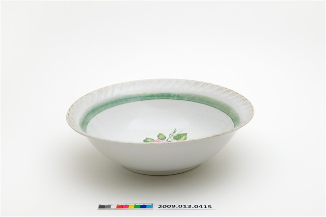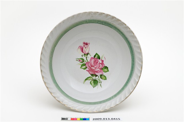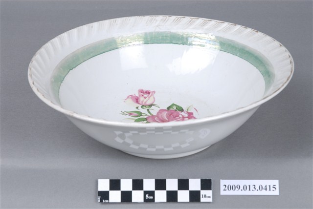 侈口、弧壁、帶圈足碗。模製成形,口緣以篦劃紋工具刻連續斜線,做出形似花口的視覺效果。碗形制為俗稱「大碗公」的大型深腹碗餐具,戰後初期1950年代至1960年代十分流行的臺灣湯碗形制。圈足露胎處顯示胎質灰白堅硬,燒製溫度高,瓷化程度頗高。外底心有「金義合製」方形款識。該件湯碗口沿以金彩描邊,碗腹裝飾一圈綠彩線圈,內壁紅、綠彩轉印玫瑰花束,玫瑰花或盛開或半開或含苞,盡情表現明暗光影的漸層色彩變化,繪畫性視覺效果強烈。這是戰後初期彩瓷發展的高峰。