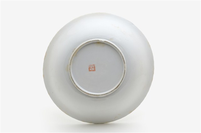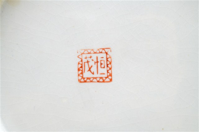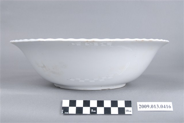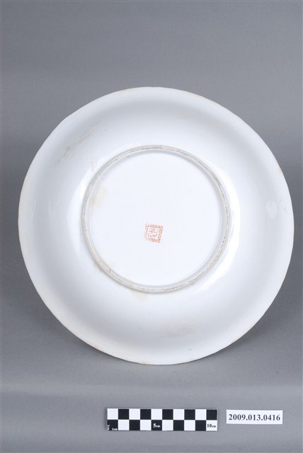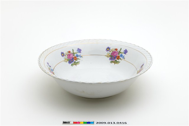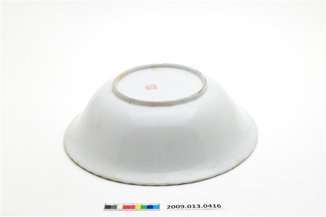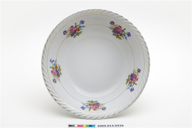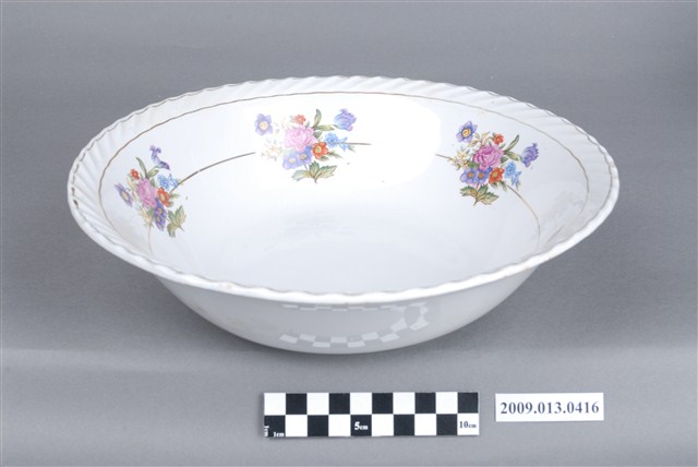 侈口、弧壁、帶圈足碗。模製成形,口緣以篦劃紋工具刻連續斜線,做出形似花口的視覺效果。碗形制為俗稱「大碗公」的大型深腹碗餐具,戰後初期1950年代至1960年代十分流行的臺灣湯碗形制。圈足露胎處顯示胎質灰白堅硬,燒製溫度高,瓷化程度頗高。該件湯碗內壁近口沿處裝飾三圈細線金彩,環繞碗腹以第三道金彩線圈為中軸線,等距離轉印貼飾五彩花束,玫瑰、雛菊等花卉奔放開展。外底心有「恆茂」方形款識,臺灣北部鶯歌窯場之一。