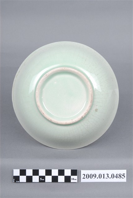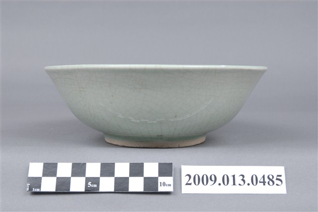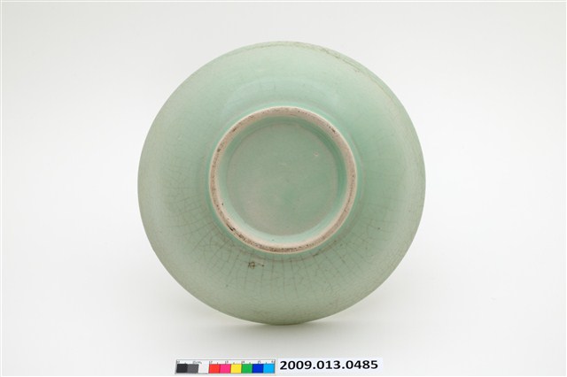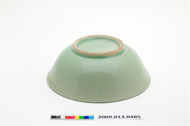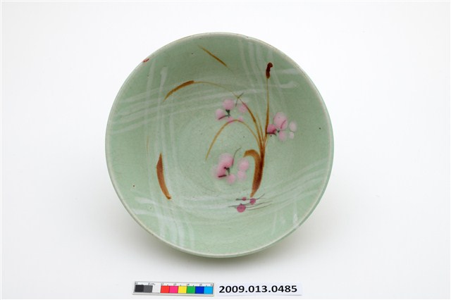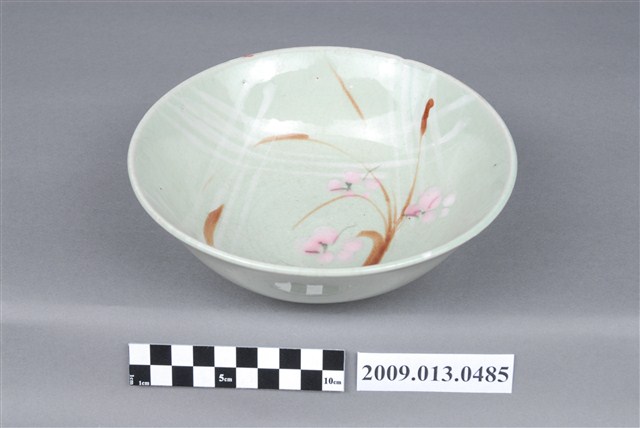 俗稱「大碗公」的常民餐具。敞口、圓弧壁、帶圈足碗。模製成形,全器除圈足之外滿釉,圈足刮釉露胎。器體內外施罩淡綠釉,猶如一池靜謐的湖水,清麗動人。碗外壁素面無紋,內器壁以白、粉紅、黃褐彩,寫意筆繪折枝花卉紋,再刷毛白泥輕使交錯的斜直線相映襯,清新可人。五花瓣的粉紅花束,盡情伸展舞動,幾許粉紅點落花增添畫面詩意。該件作品胎釉結合良好,保存狀態良好,根據胎釉與裝飾特徵判斷,為北部地區鶯歌等窯製品,其繽紛的色彩引領流行,是戰後初期1960年代廣受歡迎的食器。今日觀之,不但完美地滿足了機能性,也呈現出臺灣陶瓷工藝特有的傳統氣息。