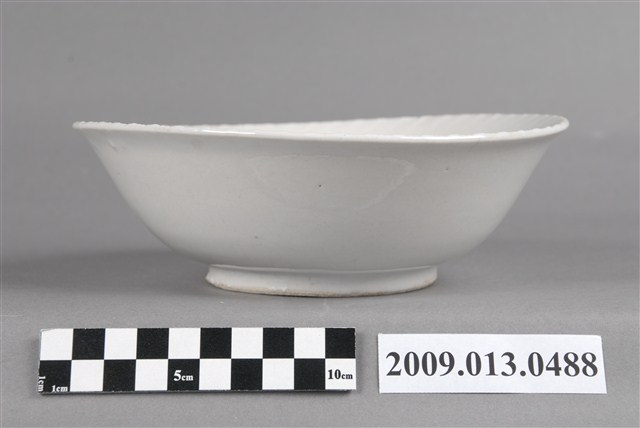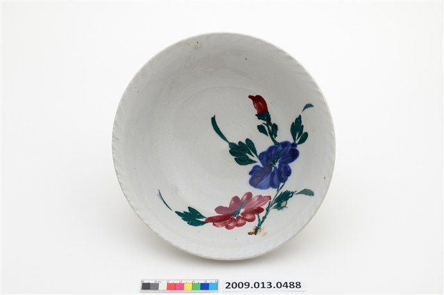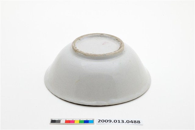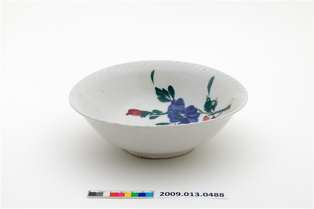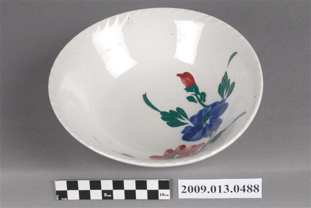 俗稱「大碗公」的常民餐具。侈口、弧壁、帶圈足碗。模製成形,口緣以篦劃紋工具刻連續斜線,做出形似花口的視覺效果。全器除圈足之外滿釉,圈足刮釉露胎,胎土白色,沾黏窯沙。內外器壁施罩白釉,光亮潔淨。碗內器壁一側以紅、藍、綠彩,寫意筆繪折枝花卉紋,盛開紅花與藍花搭配綠葉,對照晶亮白釉,彷若畫布上的靜物畫。根據胎釉與裝飾特徵判斷,為北部地區鶯歌等窯製品,其繽紛的色彩引領流行,是戰後初期1960年代前後廣受歡迎的食器。