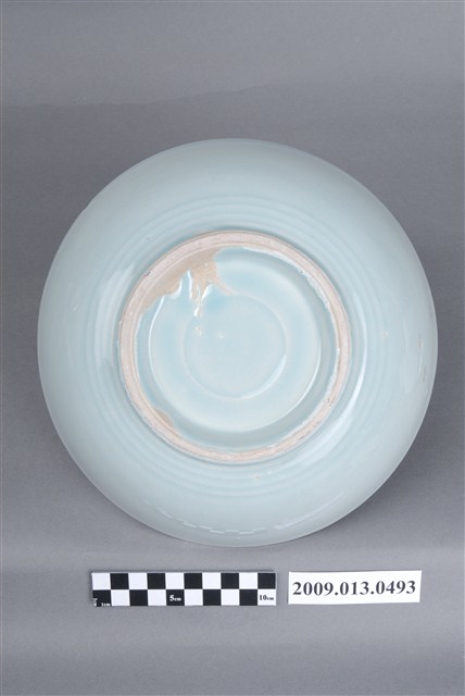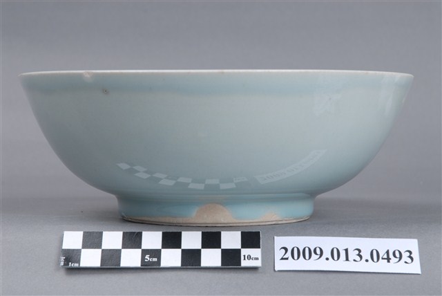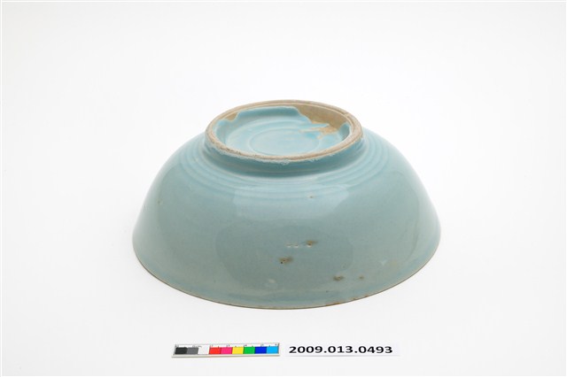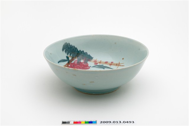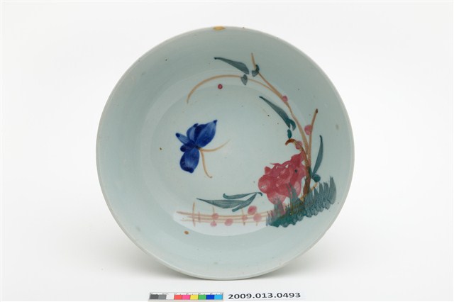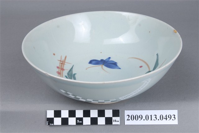 碗的形制因為大小和用途不同,主要分為比較小型的飯碗和比較大型的湯碗,由於湯碗比較大,民間俗稱「碗公」。湯碗又有幾種類型,這件作品呈敞口、深弧腹、帶圈足的造型,接近古代所謂的「墩子碗」。湯碗採模製成形,碗底心中央則特意壓模出一小圓形鏡面,圈足上方另有數道細刻弦紋,增加造型變化。全器除圈足之外幾乎滿釉,圈足刮釉露胎,胎土白色,器體內外施罩淡藍釉,外底心極小局部未及釉,外器壁釉層隨著陰刻弦紋深淺隨之變化。碗外器壁素面無紋,碗內器壁釉下多彩裝飾花蝶紋。紅花、綠籬的花園一景,藍色蝴蝶翩翩起舞。根據胎釉與裝飾特徵判斷,為北部地區鶯歌等窯製品,其繽紛的色彩引領流行,是戰後初期1950年代至1960年代廣受歡迎的餐具。這件作品與登錄號2009.013.0490同樣圖案母題與碗式,但更為精緻,品質更為高檔。碗口緣上方帶有一點人為修補痕跡,材料不詳,但黃色效果形似追摹習稱為金補(或稱為補金、金繕)的陶瓷修理工藝。